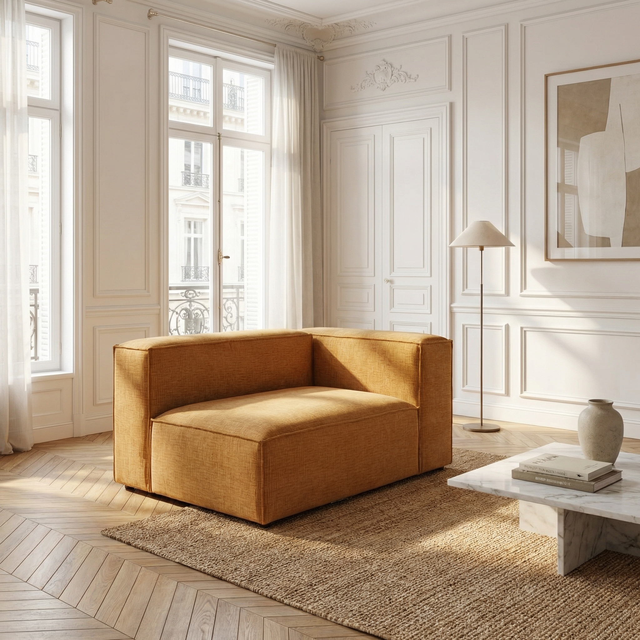 crea una imagen fotorealista a partir de este sketchup realza las texturas e iluminacion a ade iluminacion perimetral en el foseado del techo que no sea intensa haz que la estancia se vea natural