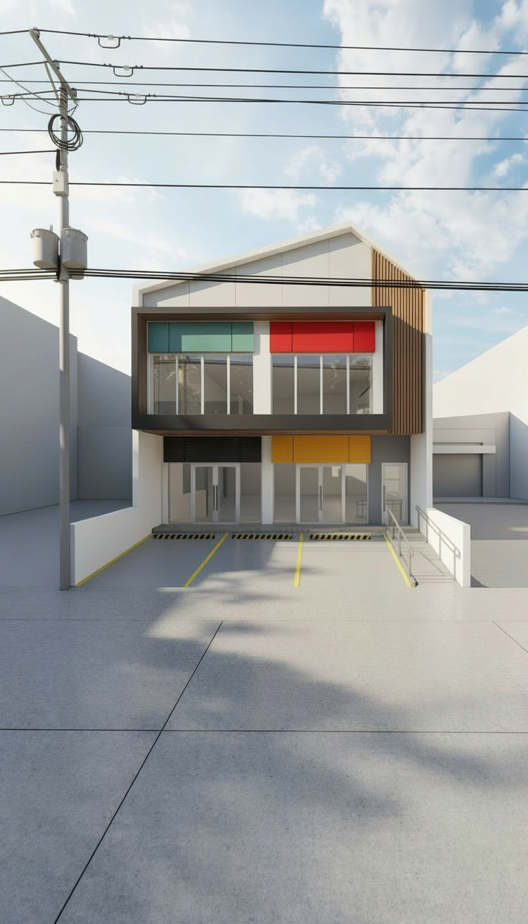 change the top of the building from a triangular form to a box type parapet wall do not change the building s color or overall design style