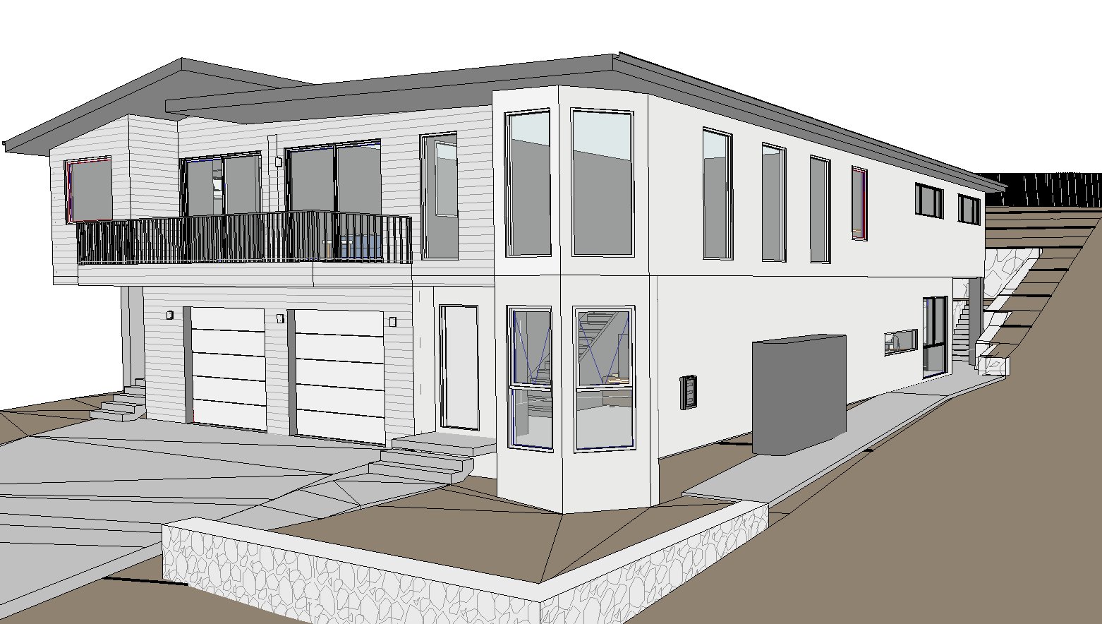 a modern two story house with a sleek design featuring a slanted roof the exterior walls are a soft white with white window frames and railings the windows are expansive providing a sense of openness the driveway is a soft neutral gray leading up to garage doors with light oak timber batten cladding the balcony railings are a frameless clear glass the surrounding landscape is dense shrubs groundcovers and trees nissan gtr r35 in the driveway with two people on the balcony skies little cloudy with sun hitting the facade with light atmospheric depth render in hyper realistic architectural visualization quality 8k resolution tall double storey christmas tree inside the right hand side double storey windows