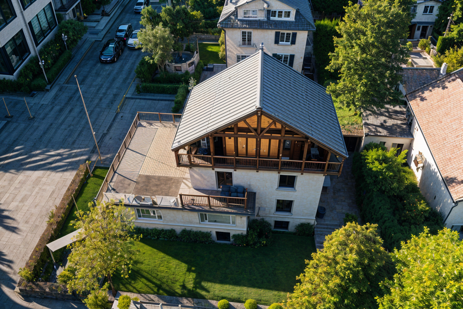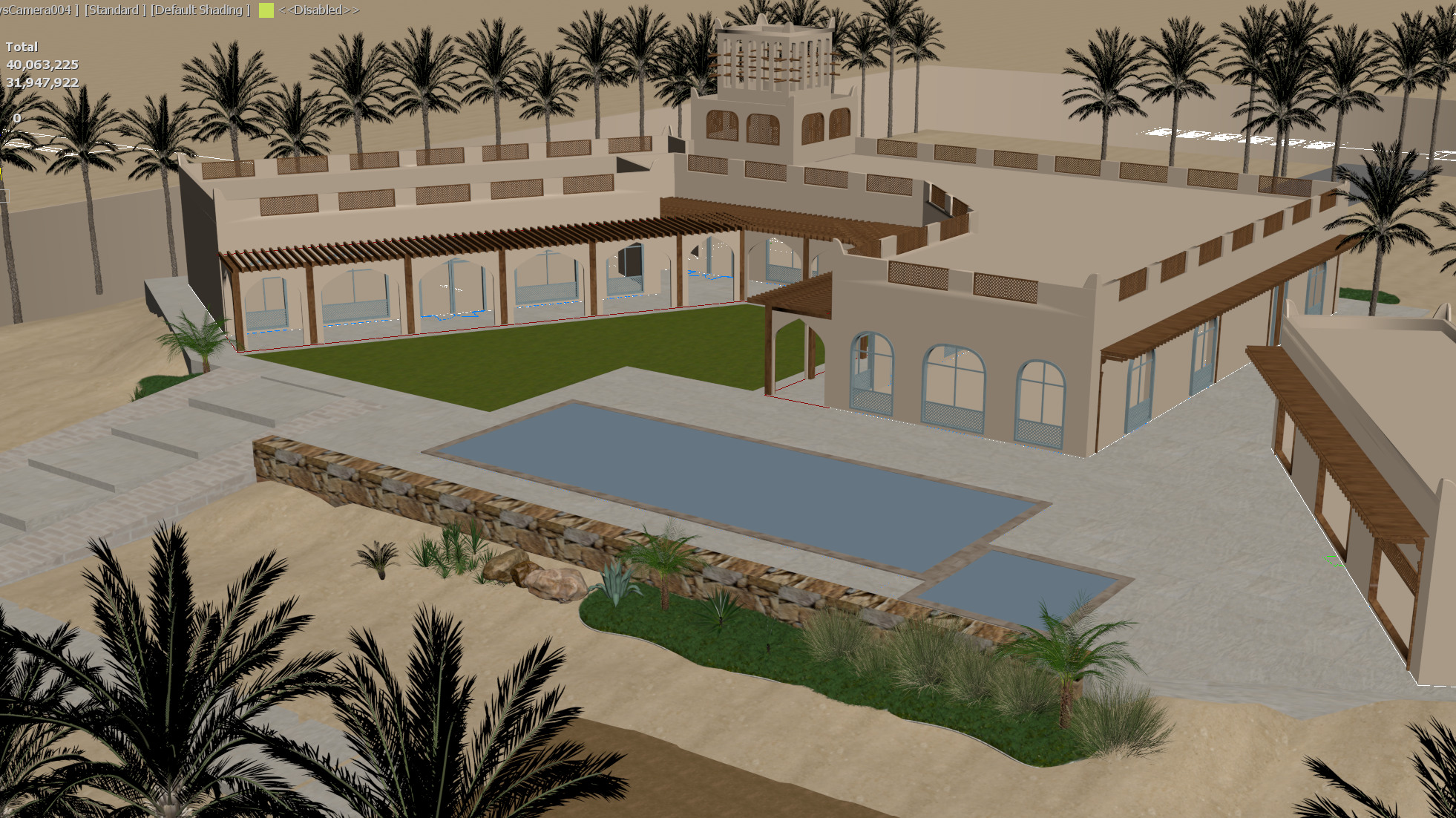 render a very photorealistic 3d perspective of this house in a ksa riyadh afternoon time don t change the material just enhance them keep model geometry the same and do not change the view make the landscape nicer light spray effect textured paint in the exterior light blue wood windows add light in the greenery area reilstic pool and jaquzzi hyper realistic architectural visualization quality 8k resolution