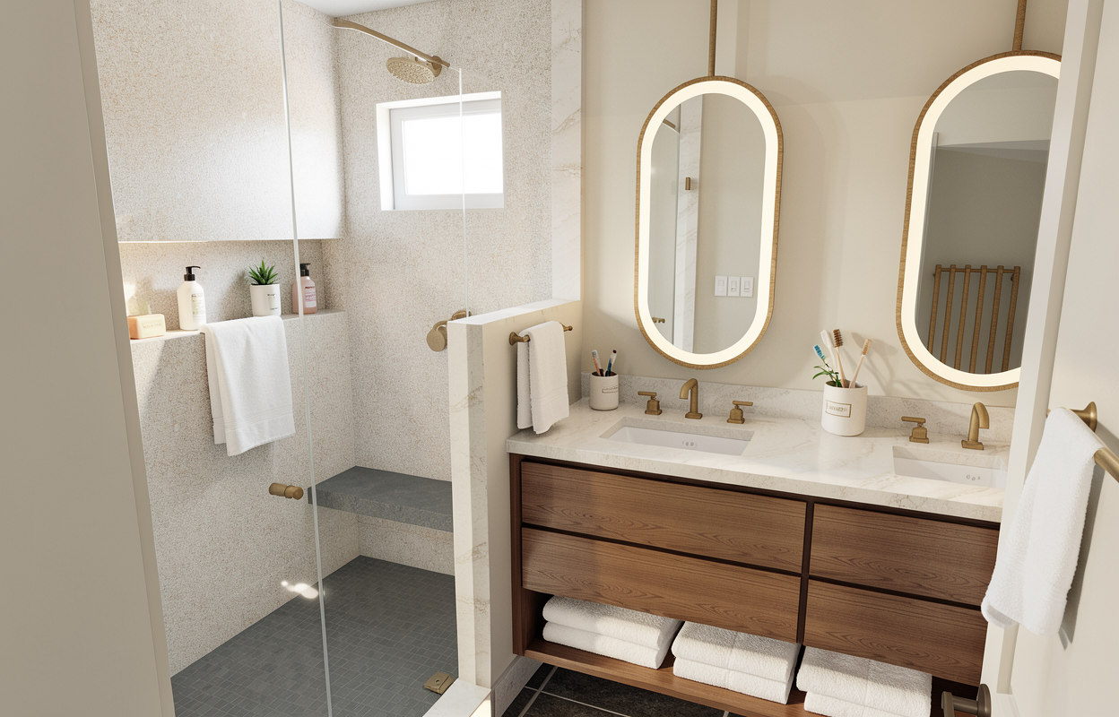 bring life to this rendering with elegant details that fit the feeling of a serene primary bathroom in the morning with simple elements like soap a cup with toothbrushes and hand towels and towels folded and stacked along the bottom shelf of the vanity add a small white hand towel on the towel bar of the pony wall in the shower niche add simple shower toiletries wall white shampoo and conditioner bottles and a small plant the only natural light is coming from the original window in the shower there should be no towel on the vanity counter or drawers keep the hardware exactly as it is keep the lighting as it is only coming from the original window keep the original size of the vanity drawers do not change the tile in the shower floor remove any towel in the shower do not add a towel to the entry door