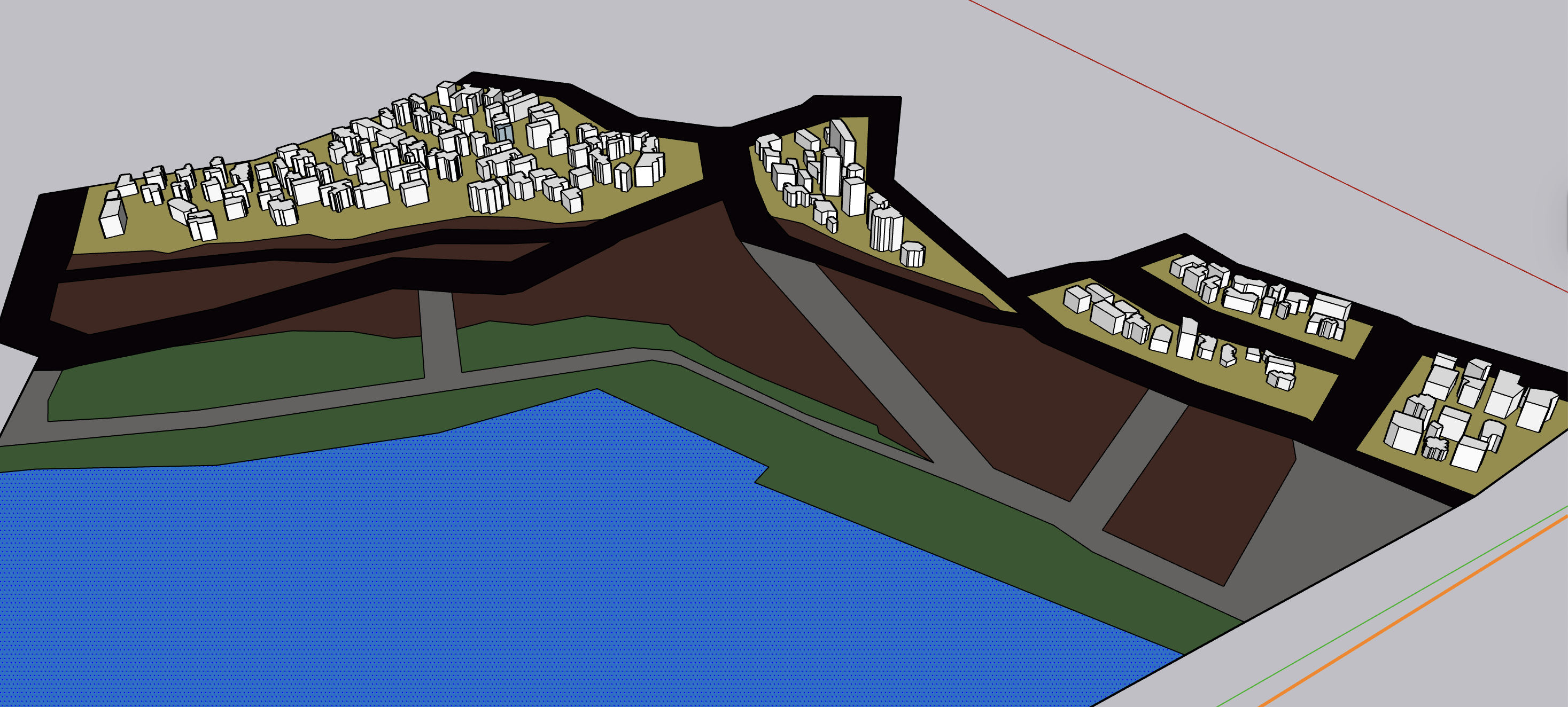 the yellow areas indicate residential zones the green areas represent the coastal restoration zone formed in response to shoreline processes the brown areas mark the government acquired demolition zone which functions as a walkable corridor during low tide an d need to show retreat process the blue areas denote the ocean the area located behind the residential zone remains designated for residential use the left hand beach has a steeper gradient behind this area the background is residential area not sea the grey are is decommissioned coastal road ghost line government acquired zone boundary and retreat setback distance 35m inland need architecture