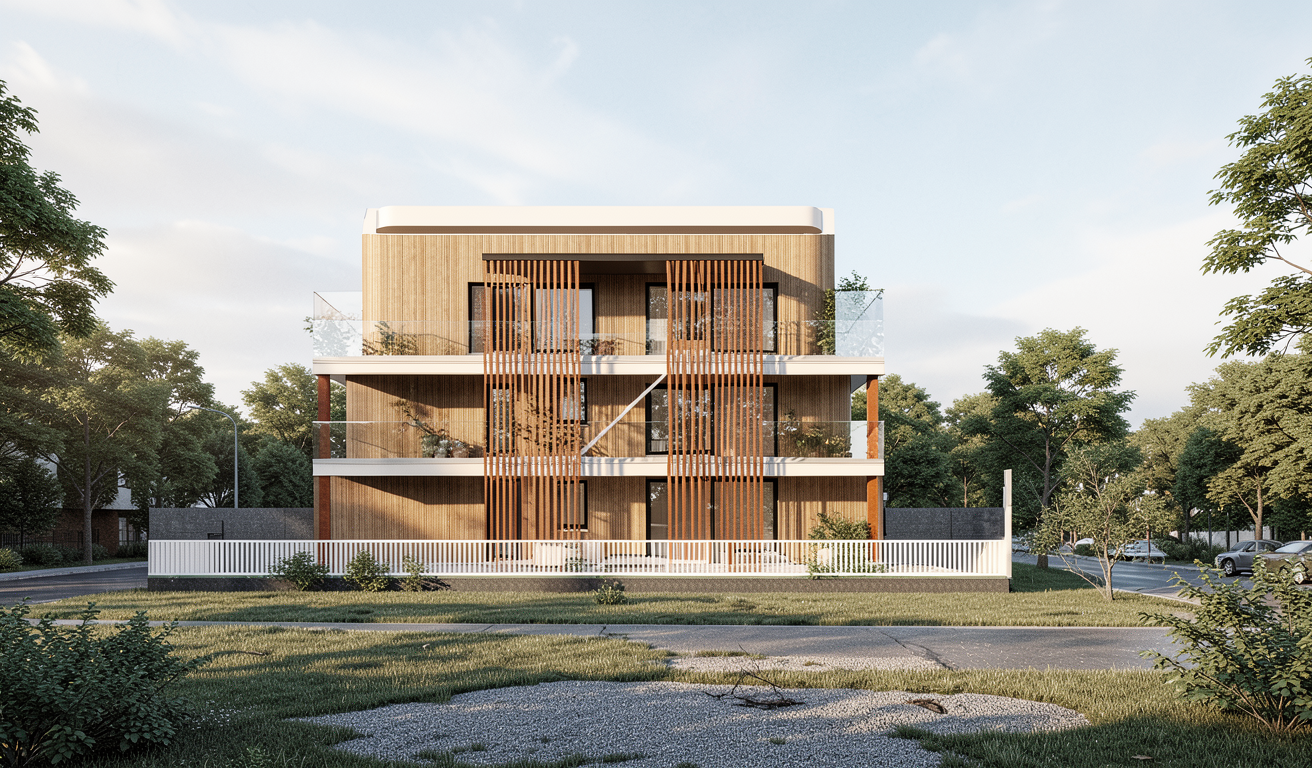 from this image without changing perspective or altering the image add a light urban context specifically we re in an urbanized area of abano terme surrounded by houses and trees the upper part of the image is finished in a light gray the sunshades are made of wood add some details such as cars and people on the right side of the image there s a small one way street place a hedge inside the property along the terraces place some tables with chairs and some plants
