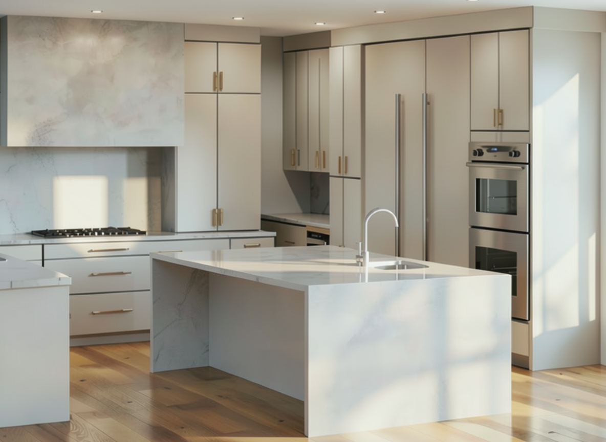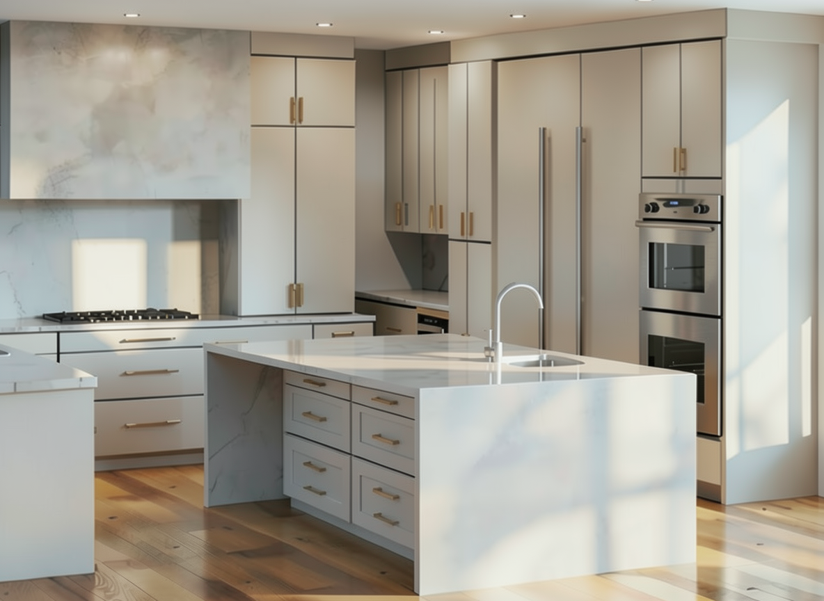 keep everything the exact same only change is under the island overhang make four cabenets not draws underneath there with the same hardware as the rest of the kitchen