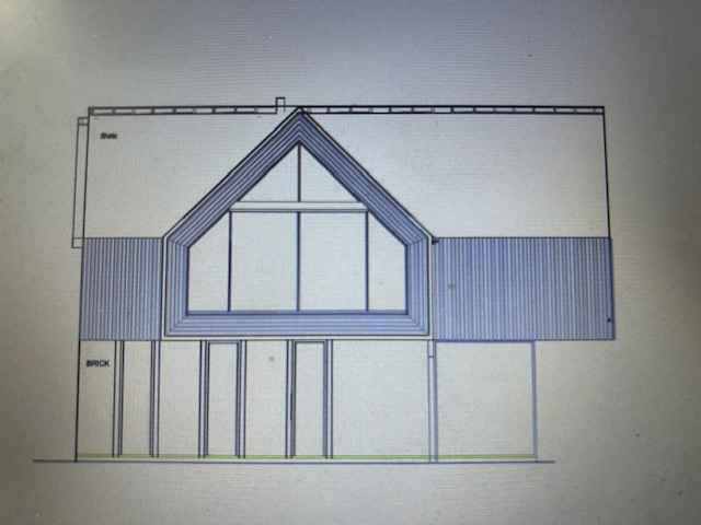 modernist exterior shot black window frames oak colour vertical cladding slate roof sandstone frame around vertical window fully glazed corner to ground floor on right architecture