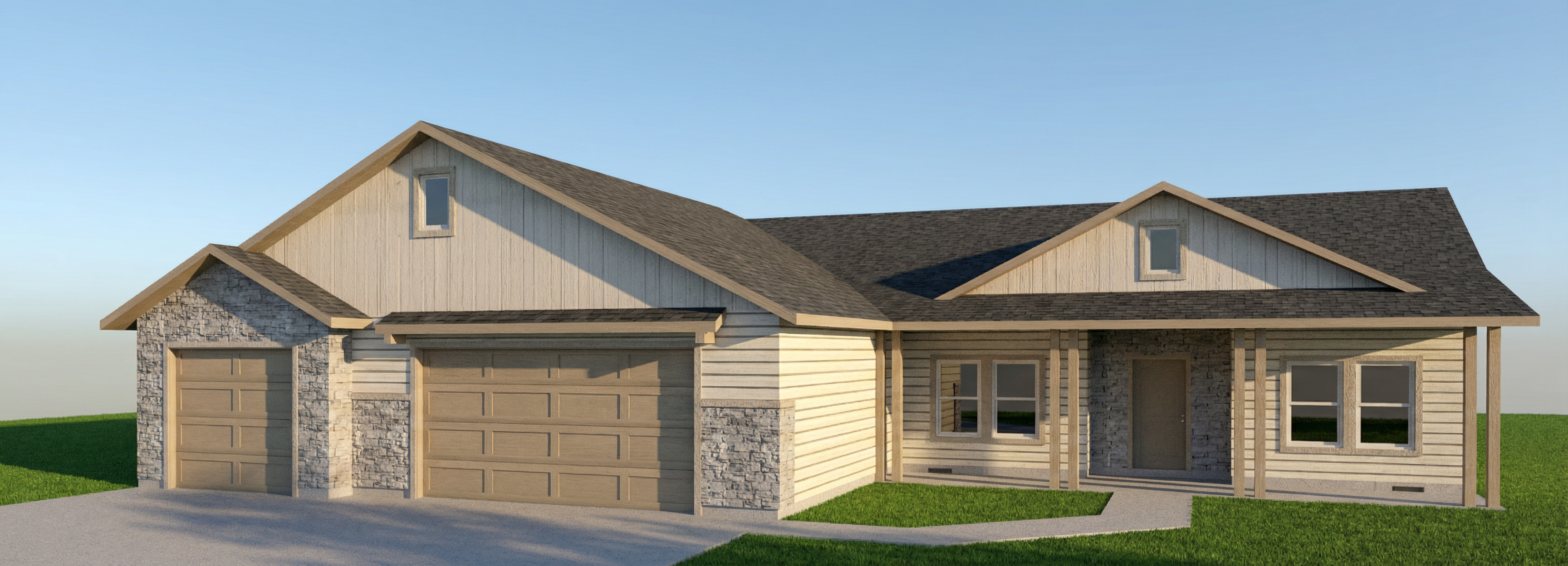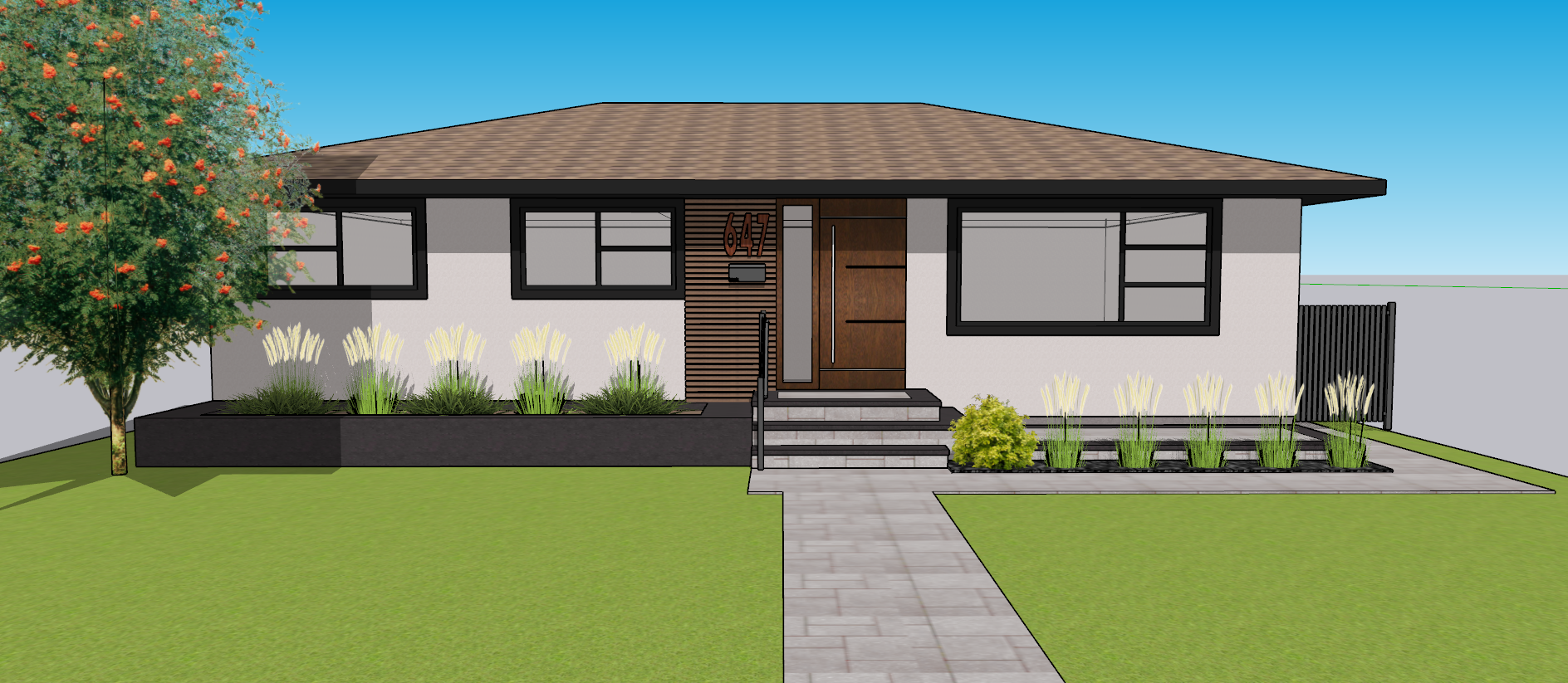 add a nice neighborhood in the background make it dusk add a small garden at the base of the house
