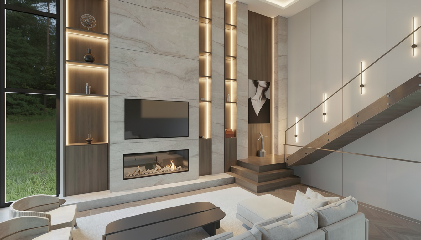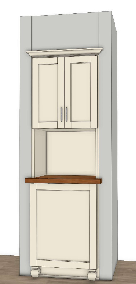 add a countertop microwave in sitting on the wood top in the open cubby and remove the sink and cabinet in the background smooth out the wall above the cabinet doors to be flush drywall