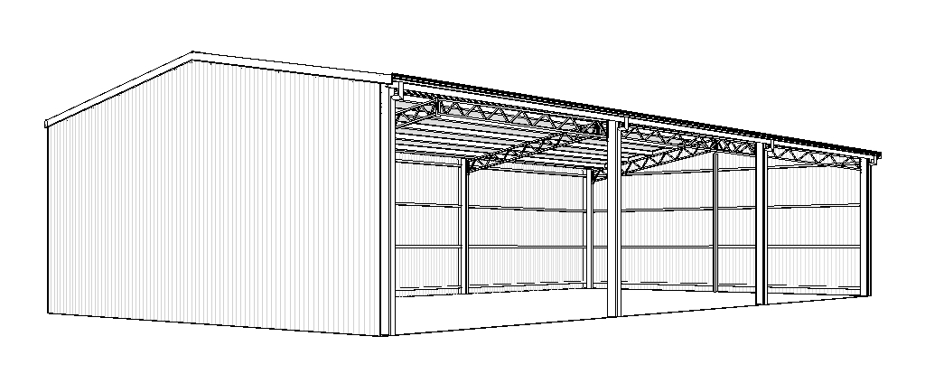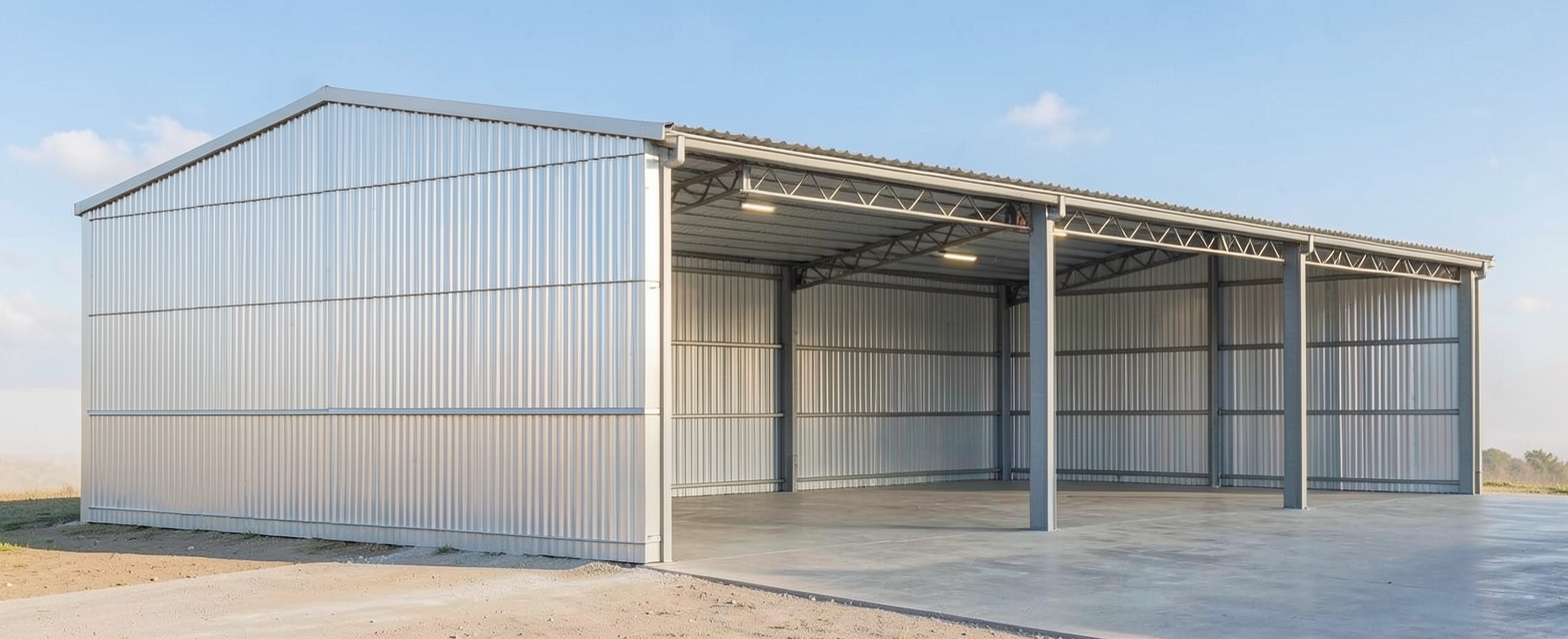 zinc corrugated walls roof concrete floor driveway no windows or doors only sky background no fence or trees