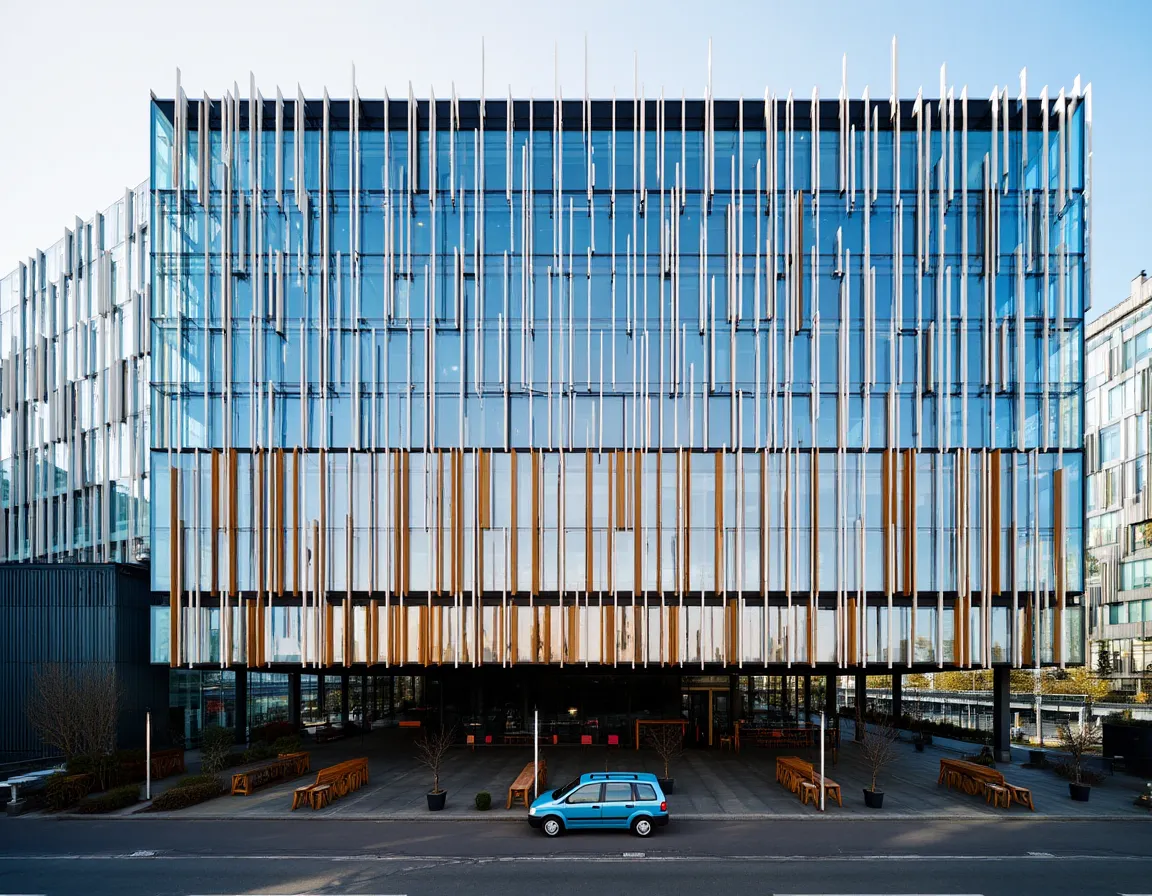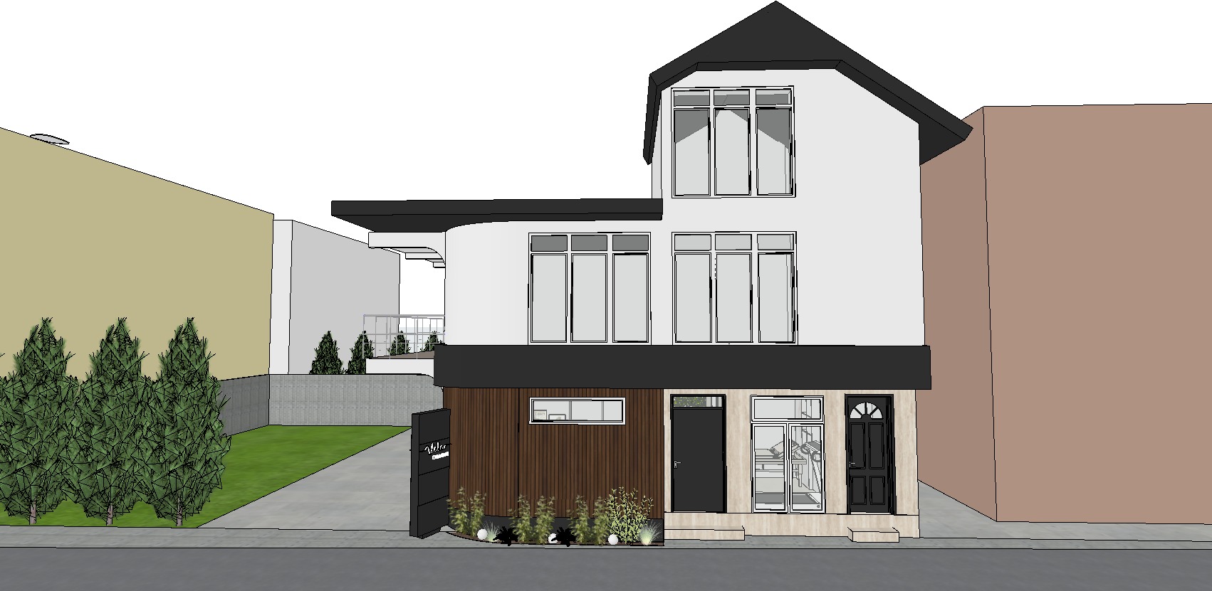 this is a residential building with the ground floor functioning as a cardiology clinic the ground floor fa ade must be clearly distinguished from the upper residential floors through materiality and visual treatment on the left side of the ground floor fa ade apply vertical wooden panels with a natural texture on the right side use travertine stone cladding with realistic surface detail and subtle natural color variation incorporate realistic greenery natural plants shrubs and landscaping elements to enhance the realism of the scene the white spheres shown in the design represent in ground lighting fixtures and should appear as illuminated ground lights the logo must remain exactly as designed do not modify its shape proportions color or placement below the logo add the text cardiovit both the logo and the cardiovit text should feature subtle led illumination with a realistic glow effect the logo and the cardiovit text are positioned on the left side within the black horizontal section that separates the ground floor from the upper floors this black section is specifically dedicated to the logo and the text no text logo or any other signage should be placed anywhere else the upper fa ade must remain completely clean only black with no writing or additional elements do not alter the fa ade design architectural composition layout proportions materials openings or any other design elements maintain the exact geometry and arrangement from the original model the task is only to enhance the rendering quality produce a high resolution photorealistic render with realistic lighting shadows reflections material textures and natural environmental context