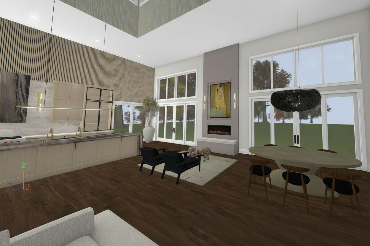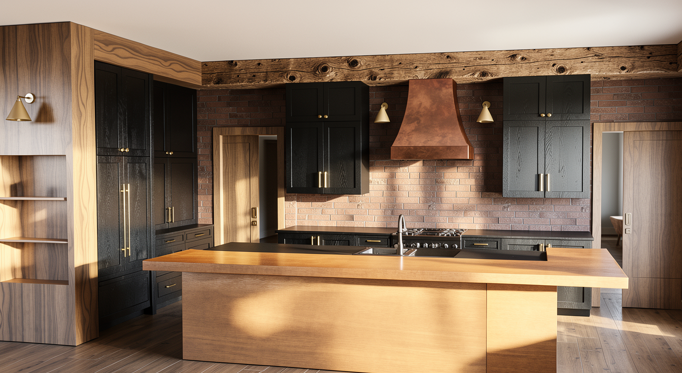 photorealistic interior render of the provided kitchen scene maintain all existing materials layout proportions and design exactly as shown do not redesign or replace any elements preserve the perimeter cabinetry as a black stained wood with visible grain matte to satin finish grain clearly readable through stain the hood vent is brushed aged copper with natural patina variation do not change material or color keep all wood tones textures and finishes consistent with the original image maintain the existing backsplash material and tone exactly as shown preserve cabinet profiles door styles hardware placement and layout keep lighting warm and natural enhancing material realism without altering color balance enhance only realistic lighting and shadows material depth and texture clarity subtle reflections and surface imperfections for realism do not change colors materials or layout add or remove design elements over modernize or stylize style high end residential natural lighting soft shadows ultra realistic materials true to life color accuracy i want to clearly see all perimeter cabinets the pocket doors on the side lead to a hallway keep it in similar color range the island is a warm medium caramel stain