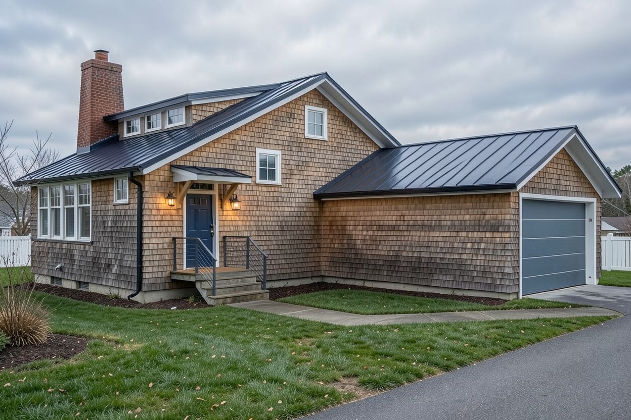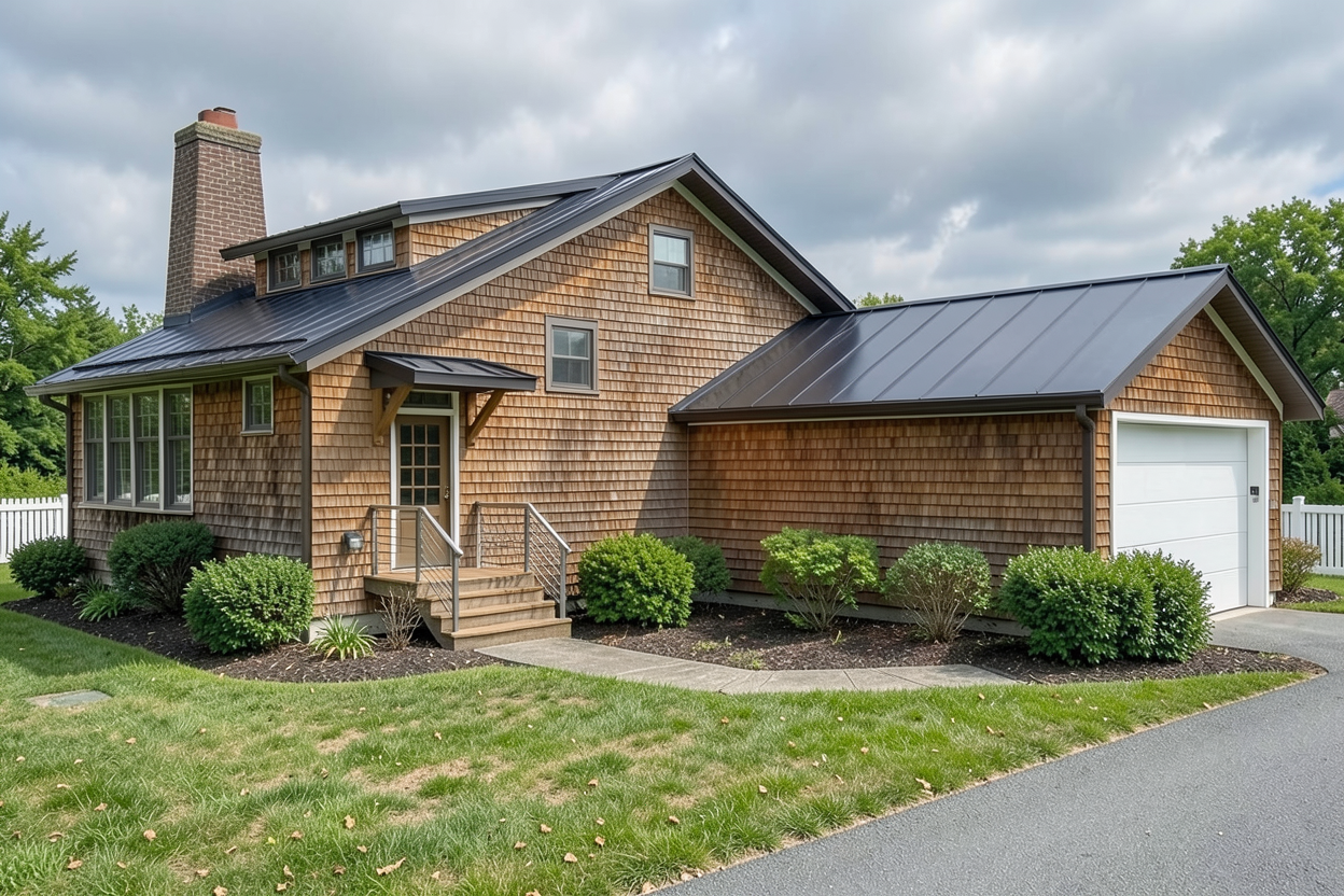 new england cottage with cedar shingle siding and a dark colored standing seam metal roof and a slightly cloudy sky fence in the background is white add bushes around the edges of the house