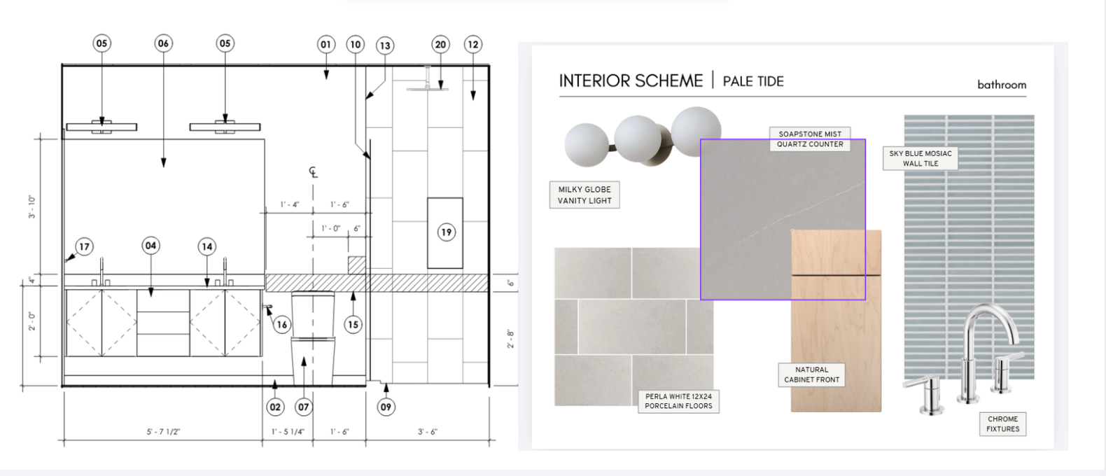 2d render to show finish representation 1x4 mosaic light blue tiles area that measures 3 6 light wood floating modern vanity polished chrome fixtures light grey countertop frameless mirror above counter 2 3 globe vanity lights above each sink all white painted drywall around vanity and toilet before it reaches the shower tile