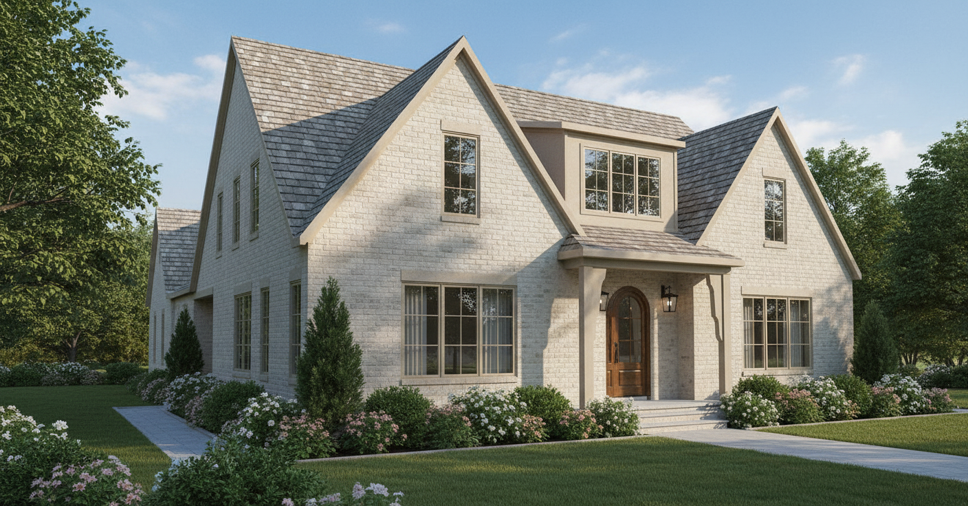 add light blue grey shutters on lower windows