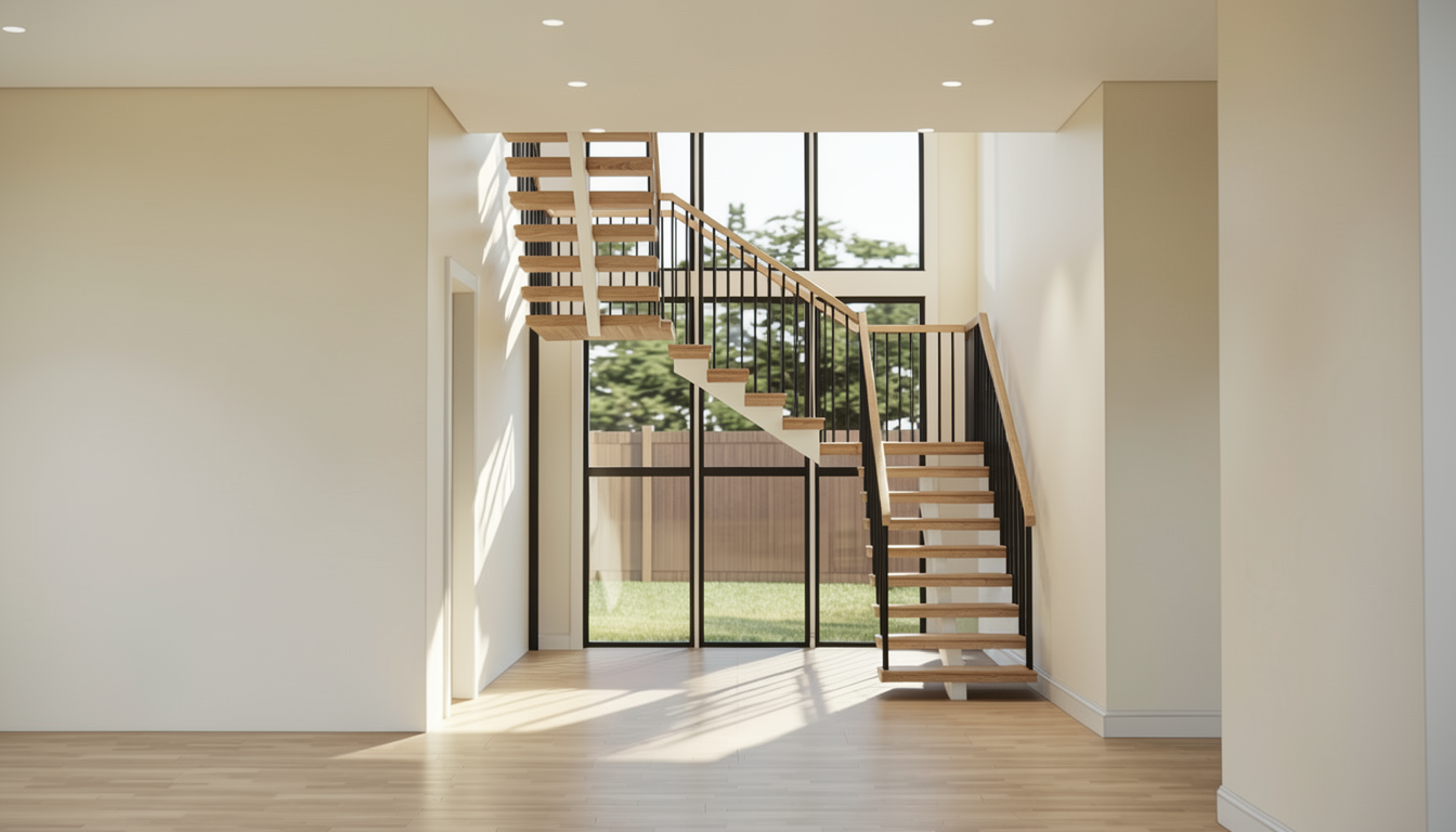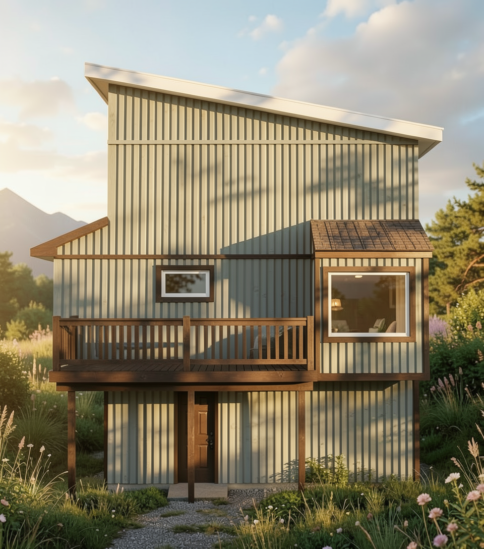 a contemporary industrial office and workshop building the architecture in the reference image must be preserved exactly the shape of the building proportions roof geometry window placement column positions overhang structural layout and all architectural elements must remain completely identical to the reference image the building geometry must not change in any way do not redesign move remove or add any architectural elements only improve materials lighting realism and environmental details while keeping the building exactly the same the building consists of a large rectangular second floor volume that cantilevers over a fully glazed ground floor the ground floor facade is made of large aluminum framed curtain wall glass panels revealing the interior steel structure the structural system includes exposed diagonal steel columns supporting the cantilevered upper floor the beams and columns are raw structural steel with a natural dark grey steel finish clearly visible through the glass facade the second floor facade is made of smooth light grey steel facade panels with subtle horizontal lines running across the facade at regular intervals of approximately 1 meter these horizontal joints create a clean industrial rhythm across the entire facade along the upper portion of the facade there is a continuous horizontal ribbon window running around the building near the corner there is a small triangular recessed window detail one section of the facade contains vertical green metal cladding panels that contrast with the light grey steel facade the architectural expression is minimal industrial and modern the surrounding site consists of dark asphalt parking areas with subtle painted parking lines simple concrete walkways run around the building with small landscaped islands containing grass and low vegetation the terrain is flat and open a few modern parked cars are visible in the parking lot a large leafy tree stands in the foreground casting soft natural shadows across the asphalt lighting is soft natural daylight under a slightly overcast nordic sky producing realistic architectural visualization lighting with soft shadows and balanced contrast materials should appear realistic including brushed steel facade panels exposed structural steel beams and columns reflective curtain wall glazing textured asphalt concrete walkways and natural vegetation the final image should look like a high quality architectural visualization or professional architectural competition render photorealistic clean minimal and modern while keeping the building geometry perfectly identical to the reference image