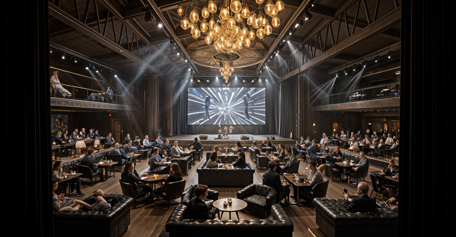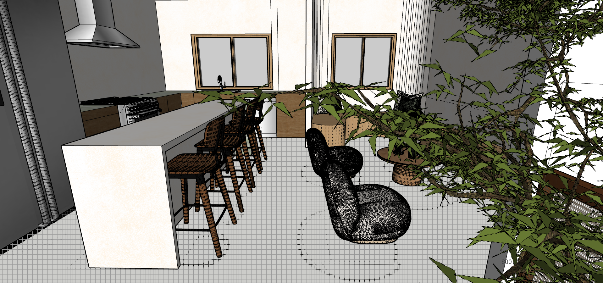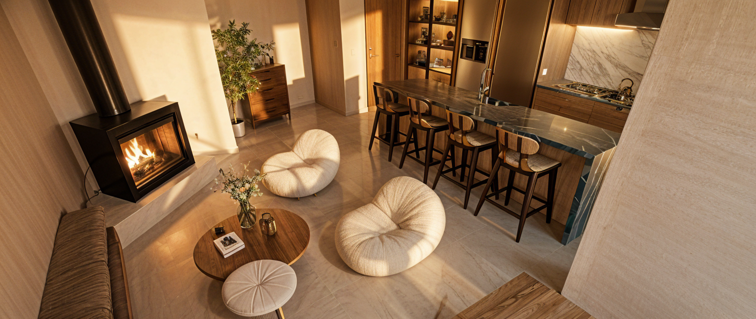 counters are light green marble and chairs are white cloud chairs there is a striped pink orange and red preuvian rug in the living area warm lighting with white walls warm light oak wood stools