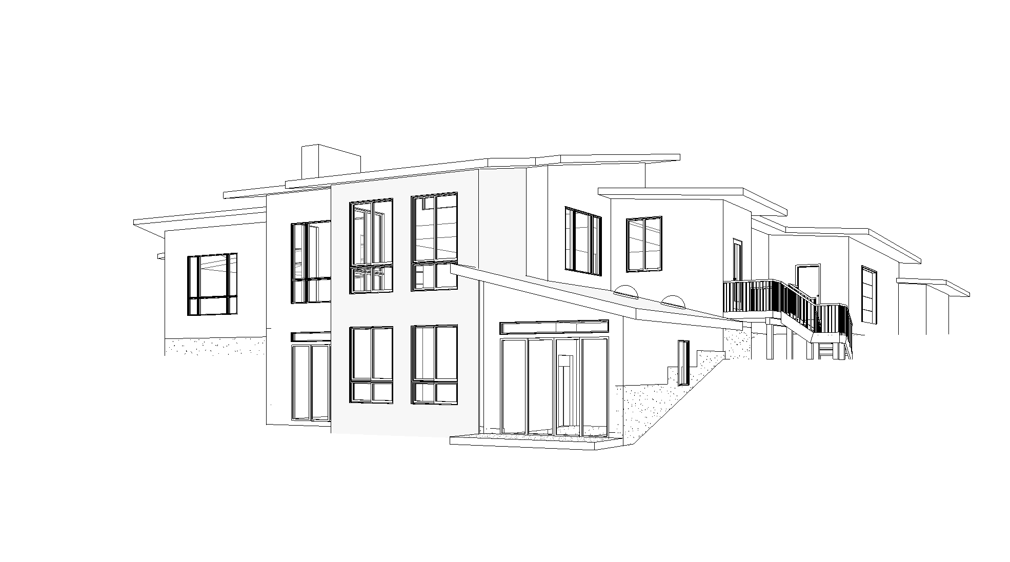 modernist exterior shot dwelling on sloped lot forest and trees in background grey stucco siding with stone rear wall architecture