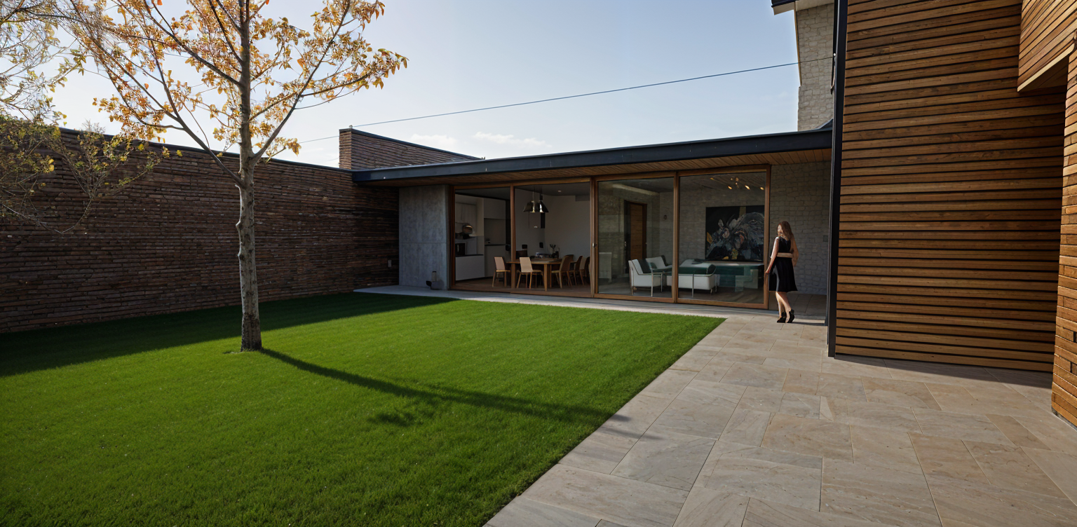 keep everything in the scene exactly the same same layout materials lighting and camera angle add a wall design like in the reference image one part made of rough dalmatian stone and the other part finished in smooth cream colored plaster knauf add a subtle linear light between the two materials highlighting the transition just like in the reference image do not move or change any other elements keep everything else identical and high quality