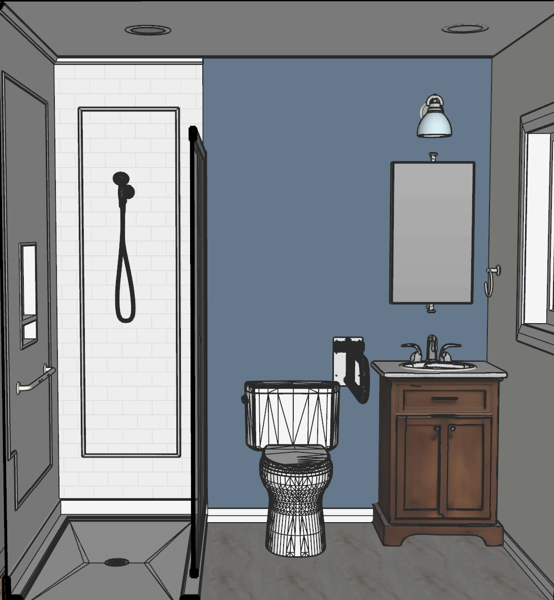 the shower walls are a white subway tile with white grout it has light blue frames around shadow boxes the niche on the left wall is white the trim is white the wall on the right is chantilly lace the wall on the back is hale navy the vanity is a brown wood the grab bar by the toilet is brushed nickel the grab bar in the shower is white the vanity light is brushed nickel with a light blue shade the floor is a off white calcutta marble luxury vinyl tile 12x24 in a brick pattern the outside environment is woods