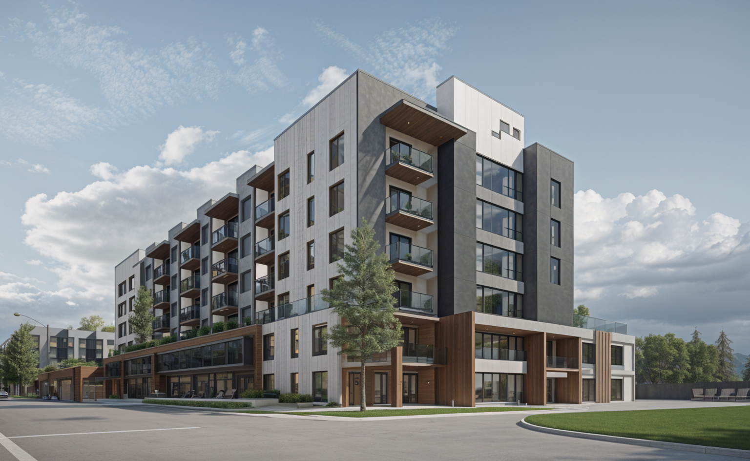 render this 6 storey multi family building in a mountain modern style while keeping all existing geometry proportions and massing exactly as shown express the character entirely through materials tone and detailing use a grounded natural palette of dark charcoal or espresso metal panels warm natural wood cedar or fir accents on balconies and soffits and locally inspired stone or textured concrete at the base highlight strong horizontal lines and deep shadow reveals to emphasize weight and shelter glazing should have dark frames and a slightly reflective tone to blend with the mountain aesthetic lighting should be warm and directional enhancing material texture and the natural richness of the fa ade the overall look should feel bold timeless and regional mountain modern refined for a mid rise scale incorporate subtle variations in tone and texture across vertical sections to break down scale and add rhythm ground level elements can use darker more durable materials like stone or brick veneer to anchor the building lighting should be soft and warm to complement the farmhouse character and the overall composition should feel cohesive with a contemporary modern farmhouse community timeless welcoming and clean without altering the existing massing or structural elements