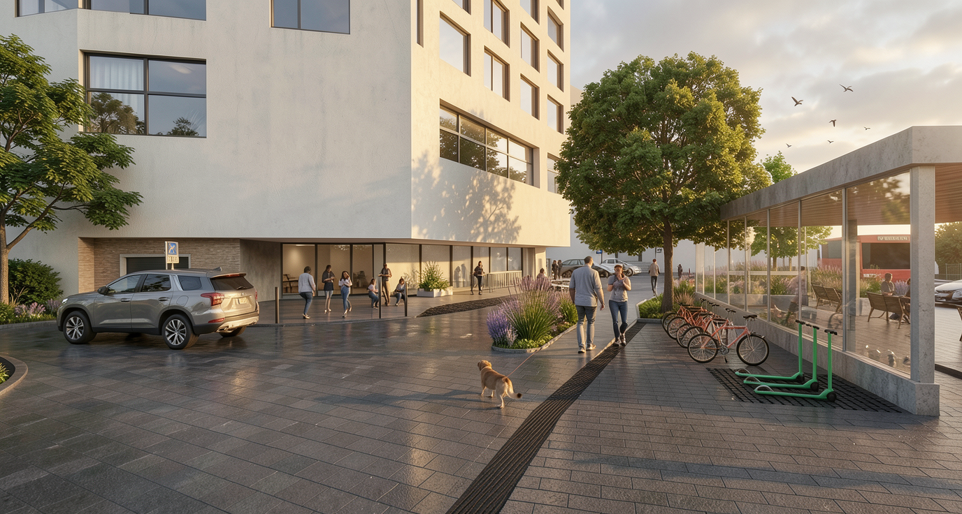 important preserve the existing geometry and the existing context exactly as provided do not modify alter reinterpret add remove scale or reshape any geometry do not change the site surroundings street layout neighboring buildings vegetation or context elements do not modify geometry scale proportions buildings road layout sidewalks or surrounding context in any way do not modify text delete all people keep the railing straight