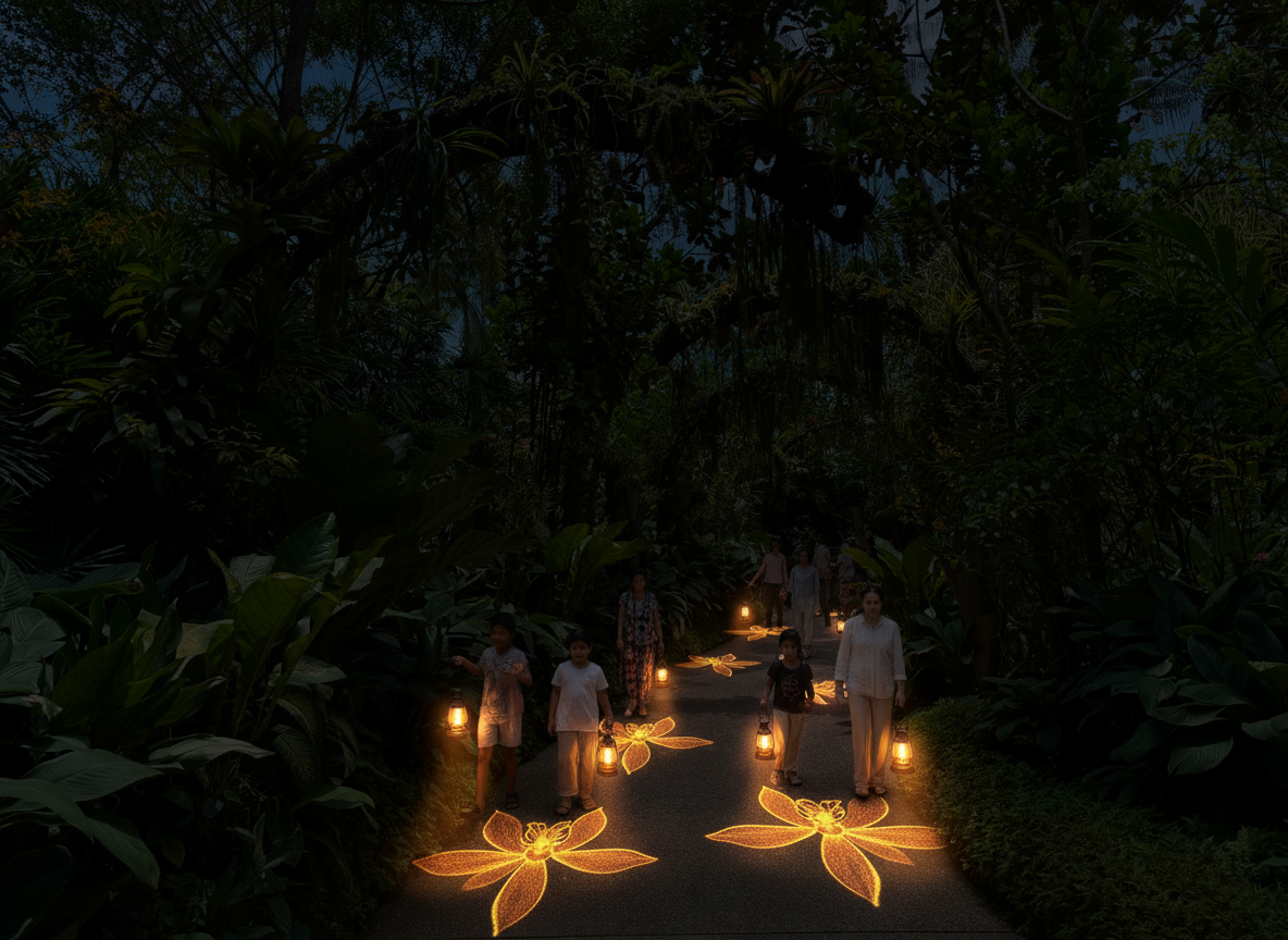 a render of a night installation at the singapore national orchid gardens numerous groups of people walk through the very dark trail carrying oil lamp lanterns each lantern shines a ring of light from the bottom illuminating the pathway