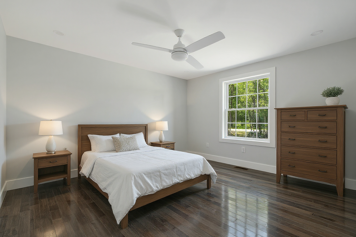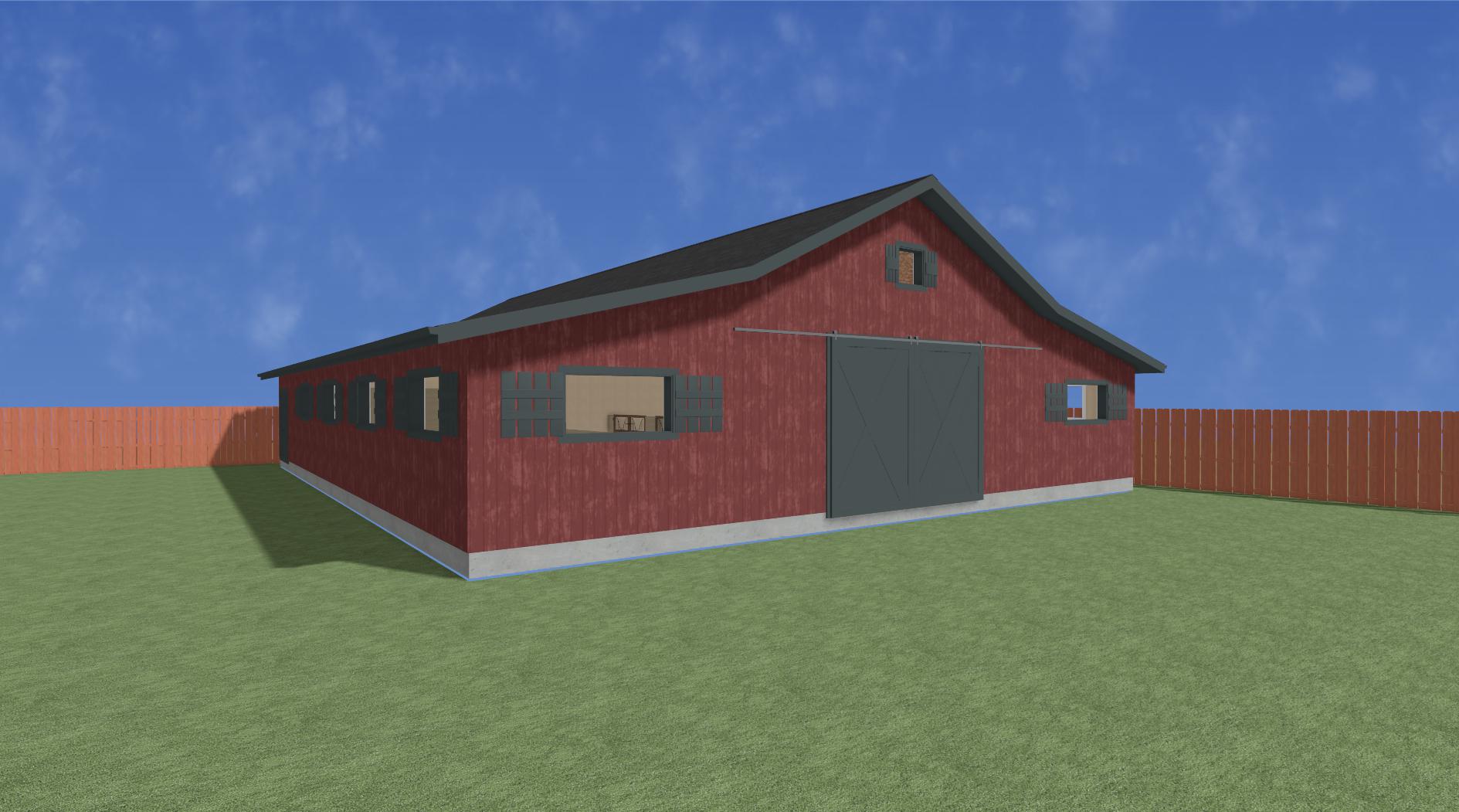 exterior shot a barn with red vertical siding black window frames and shutters black barn doors and black fascia trim the roof is asphalt composition shingle