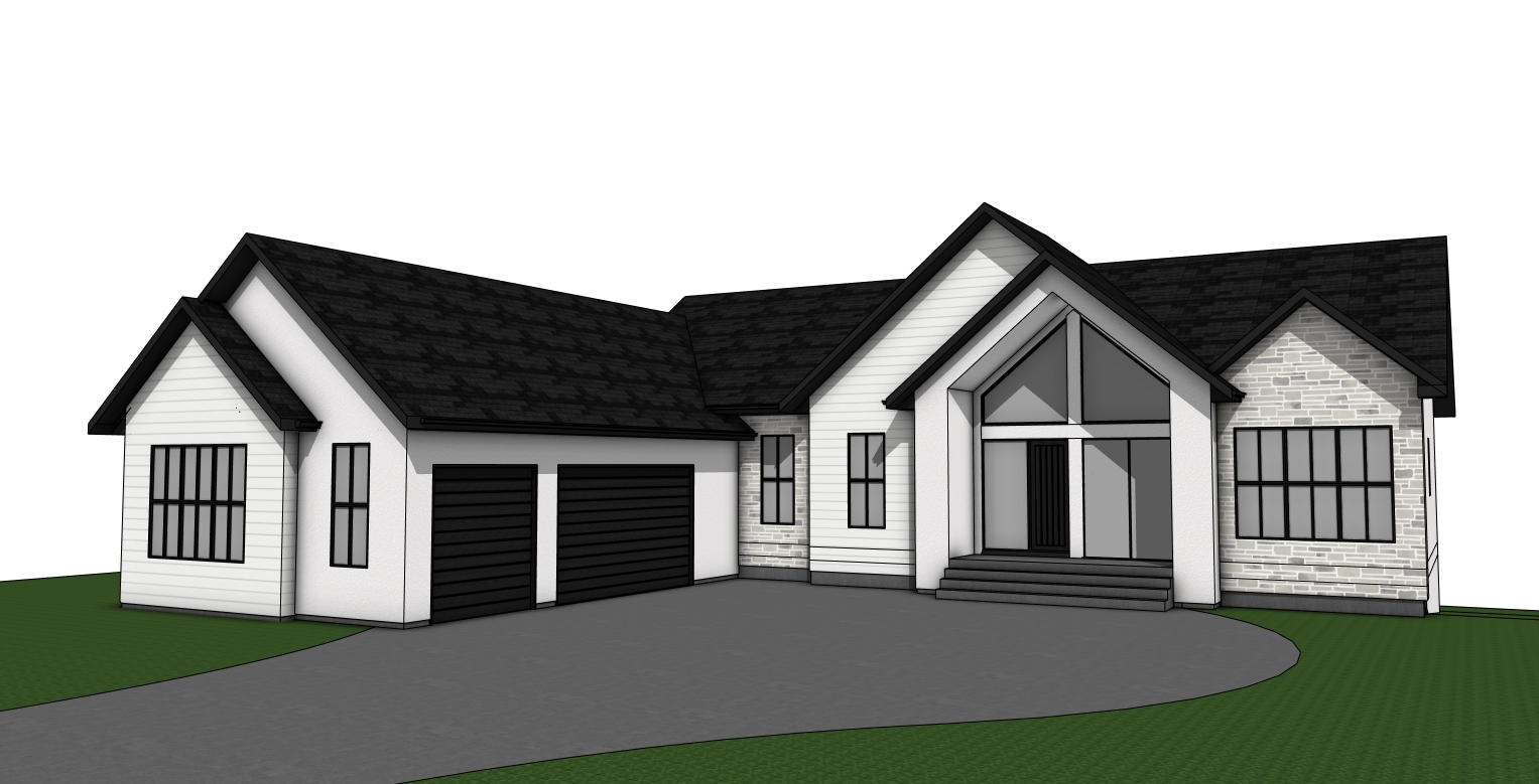 in the distant background behind home is a large river large oak and elm trees line the river and are in the back yard of the home there is some small subtle landscaping in the fron comprised of small shrubs and flowers sun is setting in the background