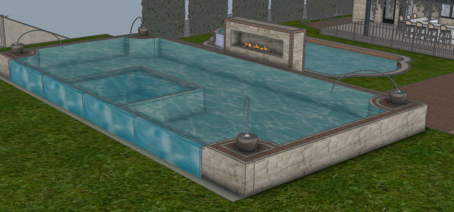 render a luxurious outdoor pool setting with a serene atmosphere the main pool glistens with clear azure blue water reflecting the sunlight fountain streams arc gracefully from elegant stone pots on each corner creating gentle ripples surround the pool with lush vibrant green grass adding a touch of nature the pool edge is built with light cream stone offering a sophisticated contrast in the background a cozy fireplace area emits a warm amber glow with an adjacent smaller pool shimmering in a light blue hue include a patio with dark wrought iron furniture set against a backdrop of lush green hedges and a modern house facade the sky is a soft tranquil gray complementing the relaxed and inviting atmosphere