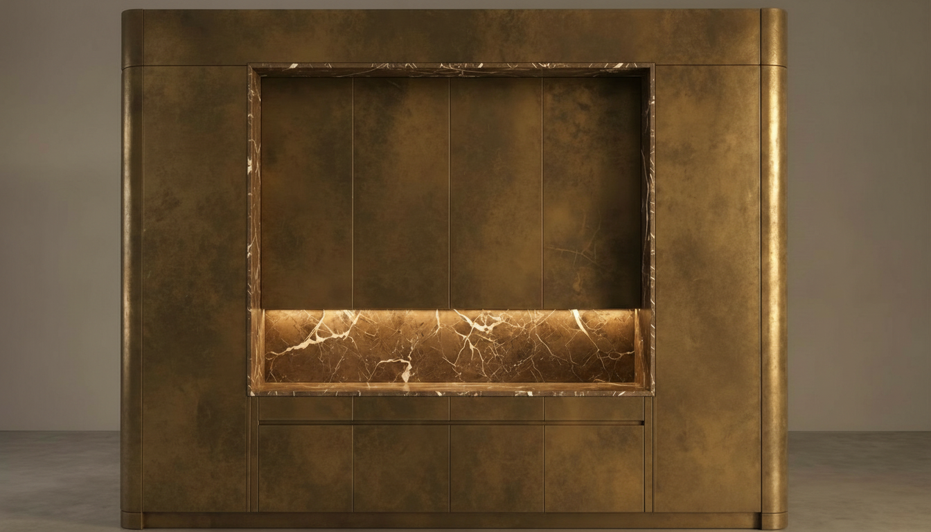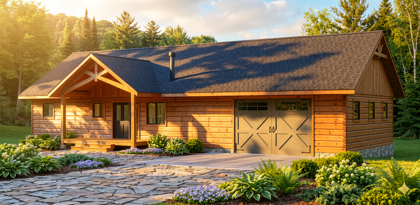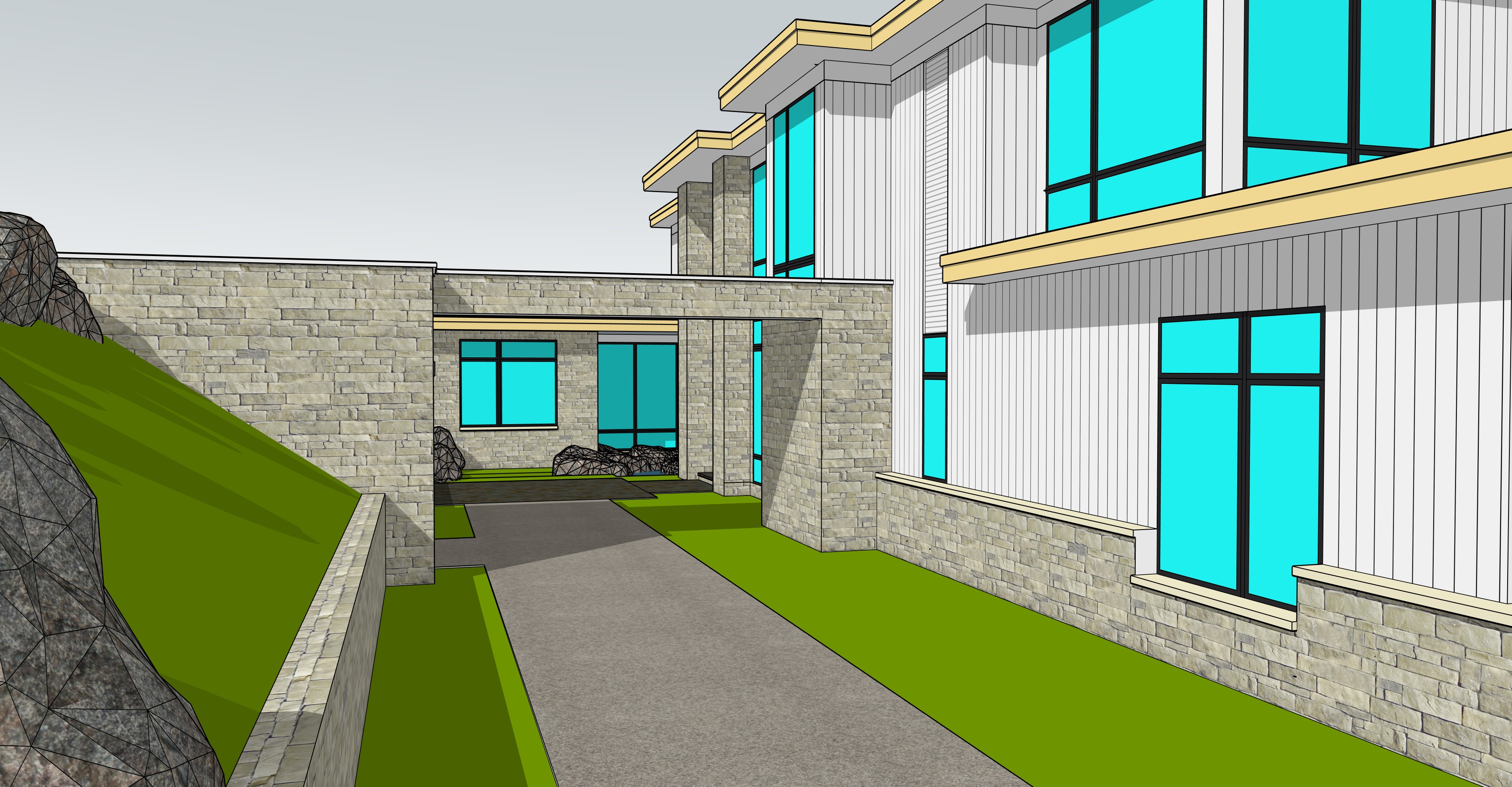 vertical stained light color taupish stained wood siding dark gray gray standing seam metal roof fascial matches siding color black window frames flat roofs to be a grayish color living roof on top of stone opening pass through blend roof into landscaping show with lush landscaping dusk setting smaller trees in the foreground on hillside integrate grasses on hillisde into living roof light coming from windows more sod like grass
