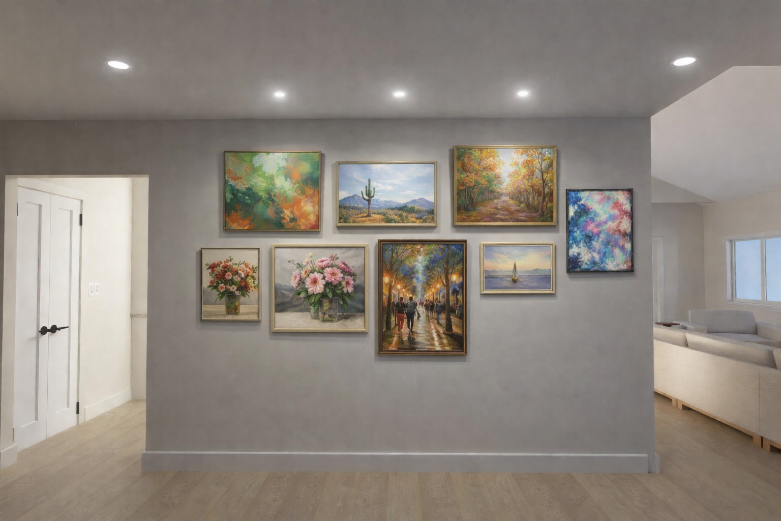 make each painting some sort of nature scape change the paintings to landscape paintings change the left 2 paintings to be rainy ocean scenes