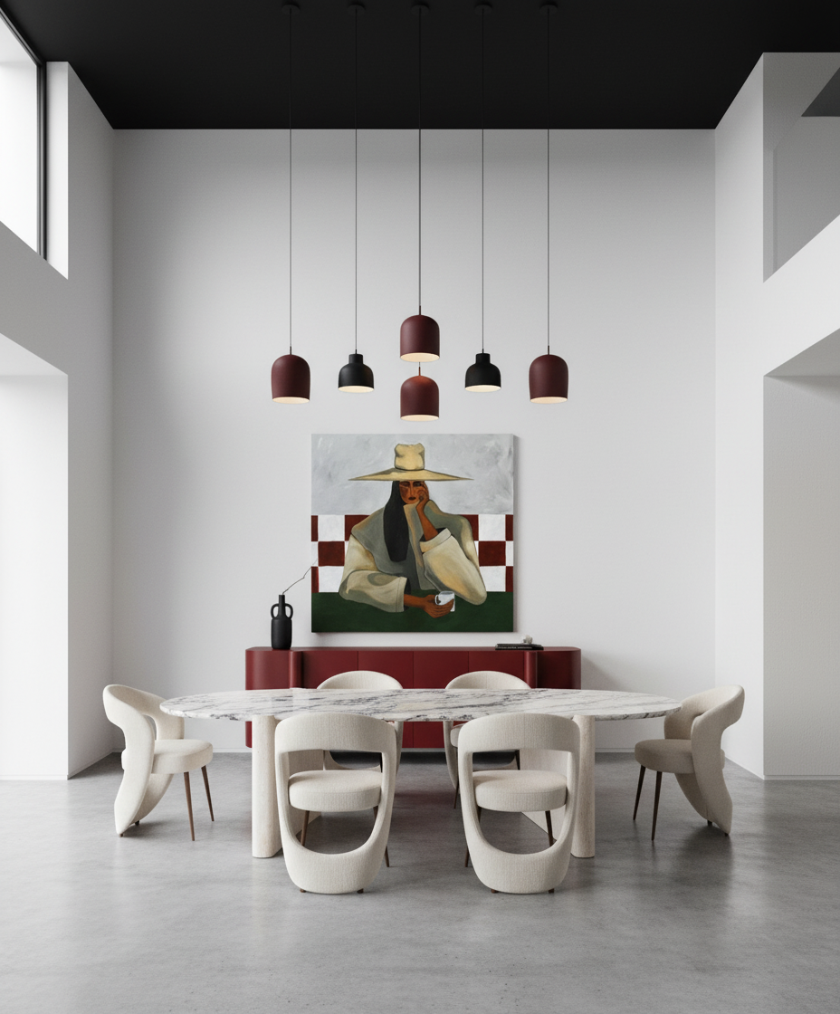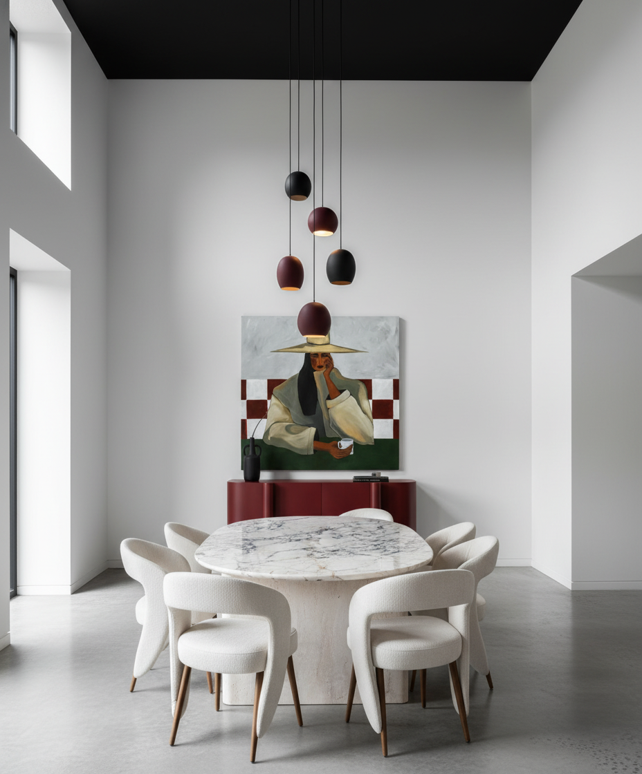 concrete floor white walls black double height ceiling big art work add burgandy and black pendents lighting glass and pottery make the buffet wider marble of the dinning table top is calacutta viola the base is travertine marble put only 6 chairs around the dinning table add 2 wall lights beside the art work same style as light pendants