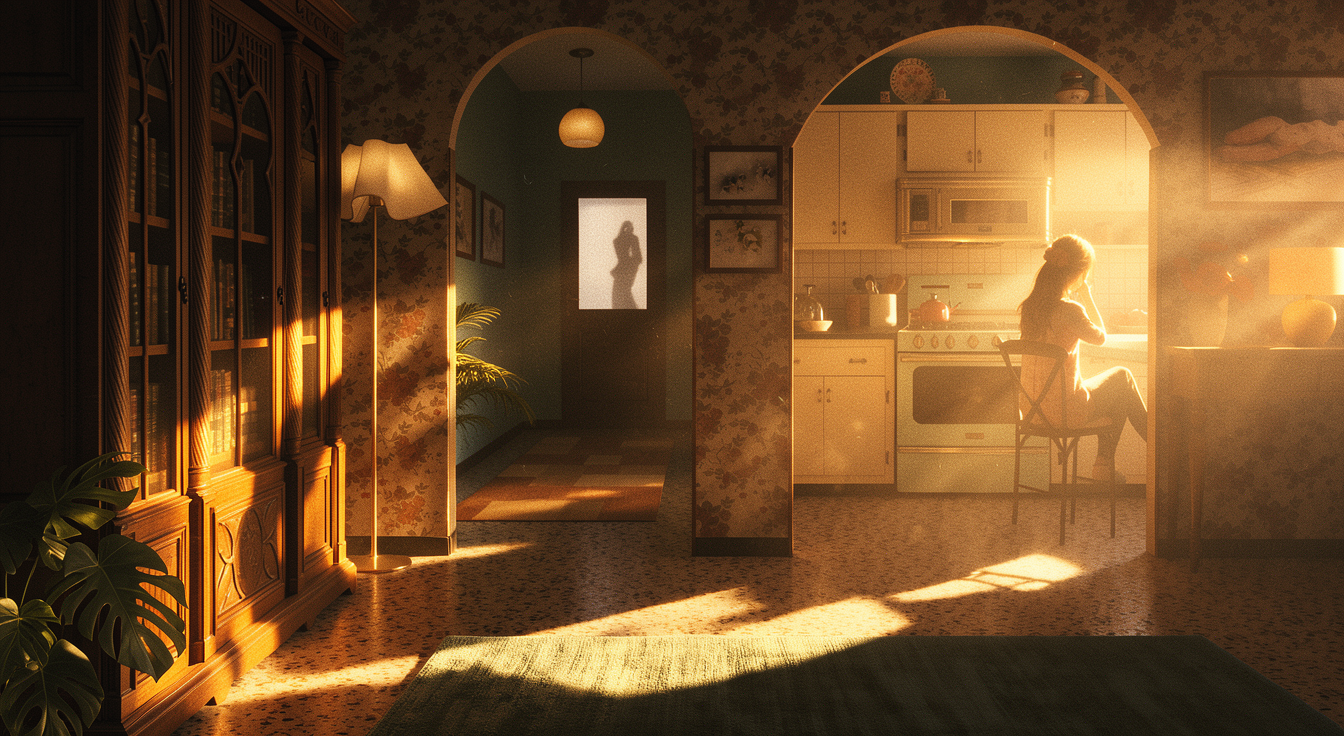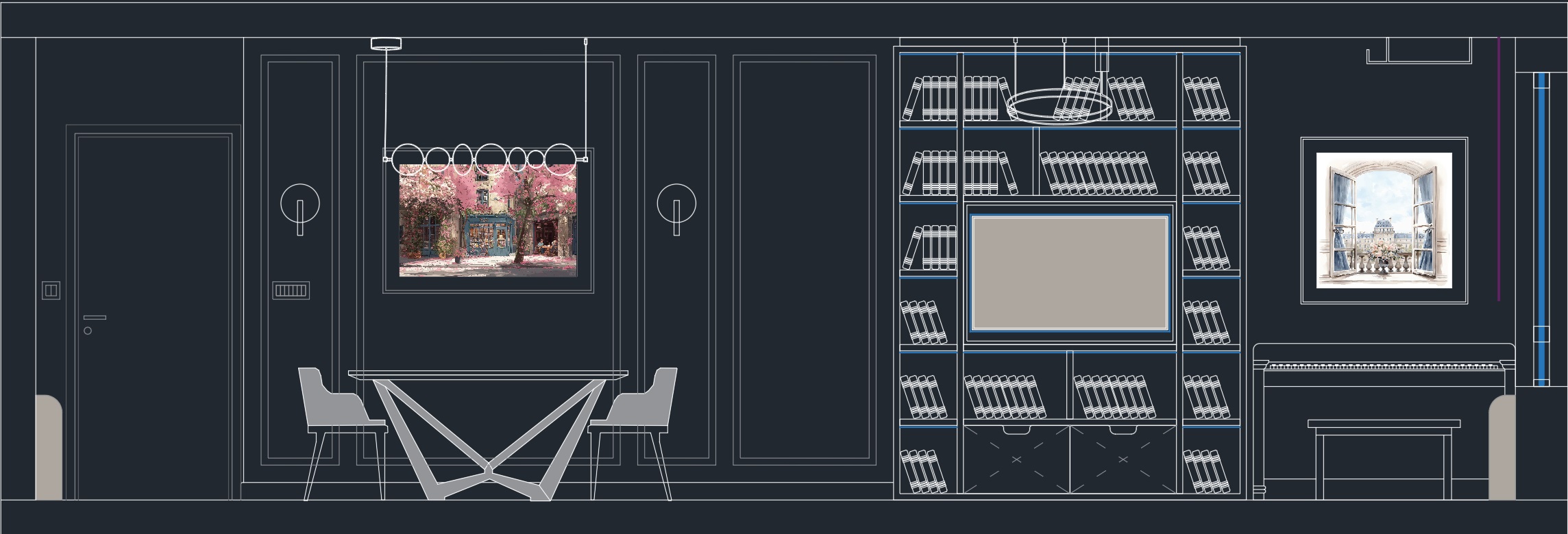 realistic classic interior elegant dining room interior with beige walls featuring refined decorative wall moldings centered framed artwork on the main wall flanked symmetrically by two classic wall sconces with warm ambient light solid wooden dining table in natural oak finish surrounded by upholstered dining chairs in soft beige fabric with subtle texture large custom built wooden library wall unit in warm wood tone integrated tv niche at the center on the right side of the library stands an upright piano pianino in matching wood finish with a minimalist piano bench above the piano hangs a framed painting aligned with the classical wall composition soft warm lighting evening atmosphere indirect ambient glow realistic shadows natural materials high detail 4k photorealistic render balanced composition eye level camera 35mm lens soft depth of field