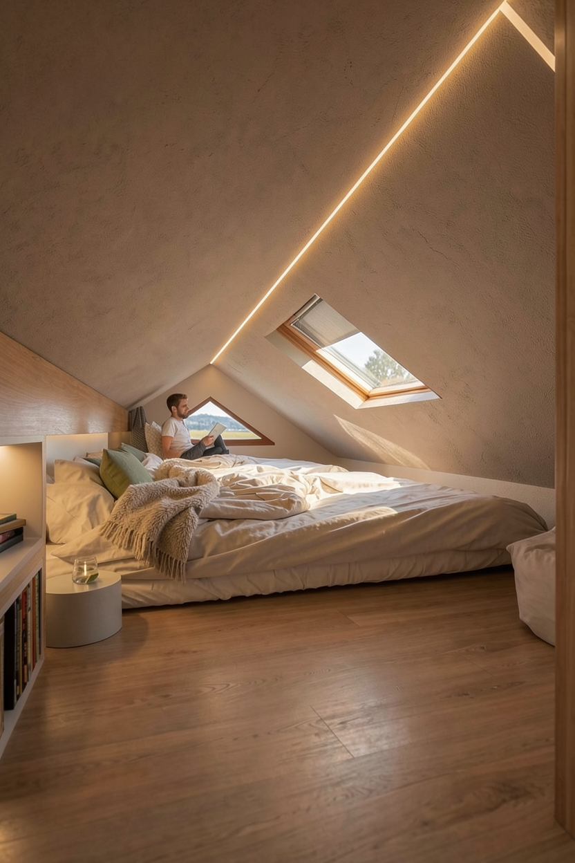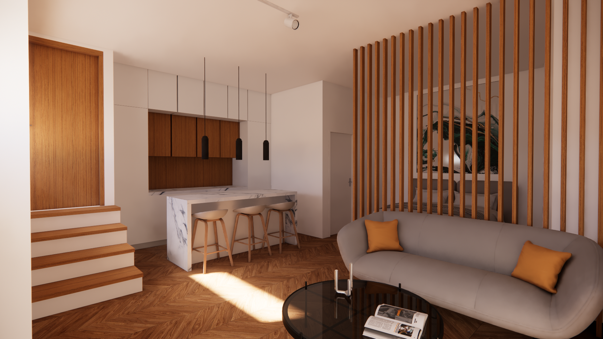 a luxurious and serene open plan studio the atmosphere is calm and inviting with modern decorations herringbone wooden floor