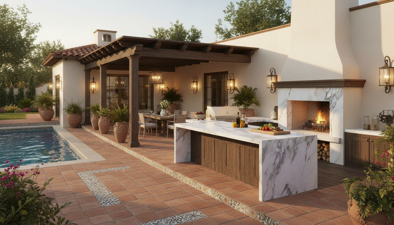 render a high end designer spanish revival wet bar from the moodboard featuring a slab of michelangelo marble as the countertops and backsplash show any light fixtures as illuminated and add warm sunlight from nearby windows place appropriate bar fixtures and bottles in the scene michelangelo marble has a white background with veins of olive green gray and subtle amber tones