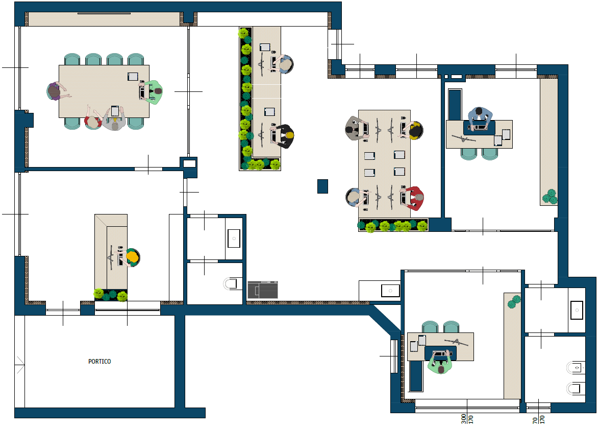 un ufficio disegnato in pianta devi mettere nella parte dove sono presenti le scrivanie pavimento effetto cemento nei bagno una piastrella color crema con dimensioni 60x60 cm le scrivanie devono essere con essenza di betulla e deve vedersi i coni di luce solare provenienti dalla parte sinistra dell ufficio