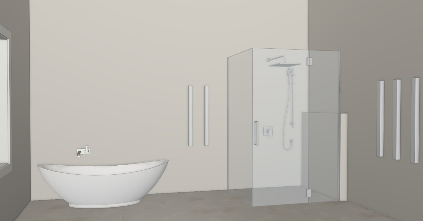 add a neutral 600x600 stone look tile to the floor and walls add a feature kit kat off white mosaic to the bath wall add natural light and someone hanging a towel on the vertical towel rails