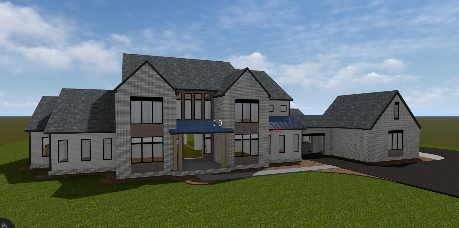 make as photorealistic as possible while keeping textures the same as selection professional landscaping in a lightly wooded scene with good lighting white brick black roof black windows match plan black front door