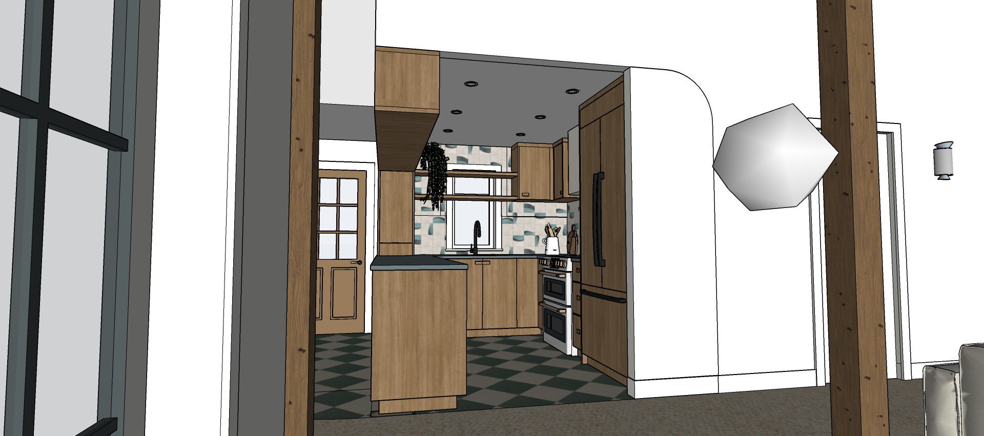 render a modern kitchen scene with a cozy and warm atmosphere use natural wood tones for the cabinets and vertical beam and a contrasting dark granite countertop the backsplash should feature a mosaic of soft blue white and gray tiles set ambient lighting to a soft glow with ceiling lights casting gentle warm white illumination the wall paint is crisp white enhancing the contrast with the wooden elements add a lush green plant hanging over the sink and use stainless steel for the oven and refrigerator for a sleek contemporary look the floor should have a dark checkered pattern and create a seamless transition to a soft gray carpet leading into the next room