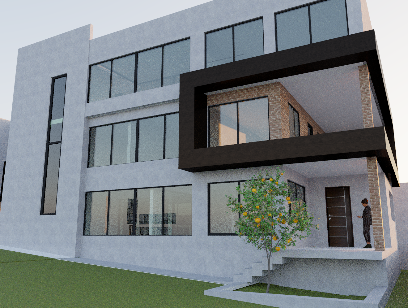 use the reference image as base composition modern laboratory and office building three story contemporary architecture with minimalist design and clean geometry facade materials smooth polished concrete facade in light gray tone large architectural frame made of polished concrete painted matte black wrapping the second floor terrace exposed red brick walls inside the recessed volume large black aluminum framed windows with floor to ceiling glazing and continuous horizontal window bands the building has large modern windows for laboratory and office spaces creating a clean and professional contemporary research facility aesthetic at the entrance there is a small concrete staircase leading to a polished concrete platform with a geometric concrete planter containing an orange tree making the tree an important landscape element that softens the architecture landscape minimal lawn clean modern planter integrated into the architecture orange tree with visible fruits as focal point near the entrance lighting and atmosphere golden hour sunset lighting warm natural sunlight hitting the concrete and brick textures soft long shadows subtle warm interior lighting visible through the windows but not excessive calm professional atmosphere rendering style photorealistic architectural visualization high quality materials v ray style realism soft global illumination balanced exposure architectural style modern mexican contemporary architecture minimalist laboratory and office building refined material contrast between polished concrete black frame glass and brick camera three quarter frontal perspective showing the entrance tree planter large windows and architectural frame ultra realistic textures subtle imperfections in concrete natural reflections on glass cinematic architectural photography