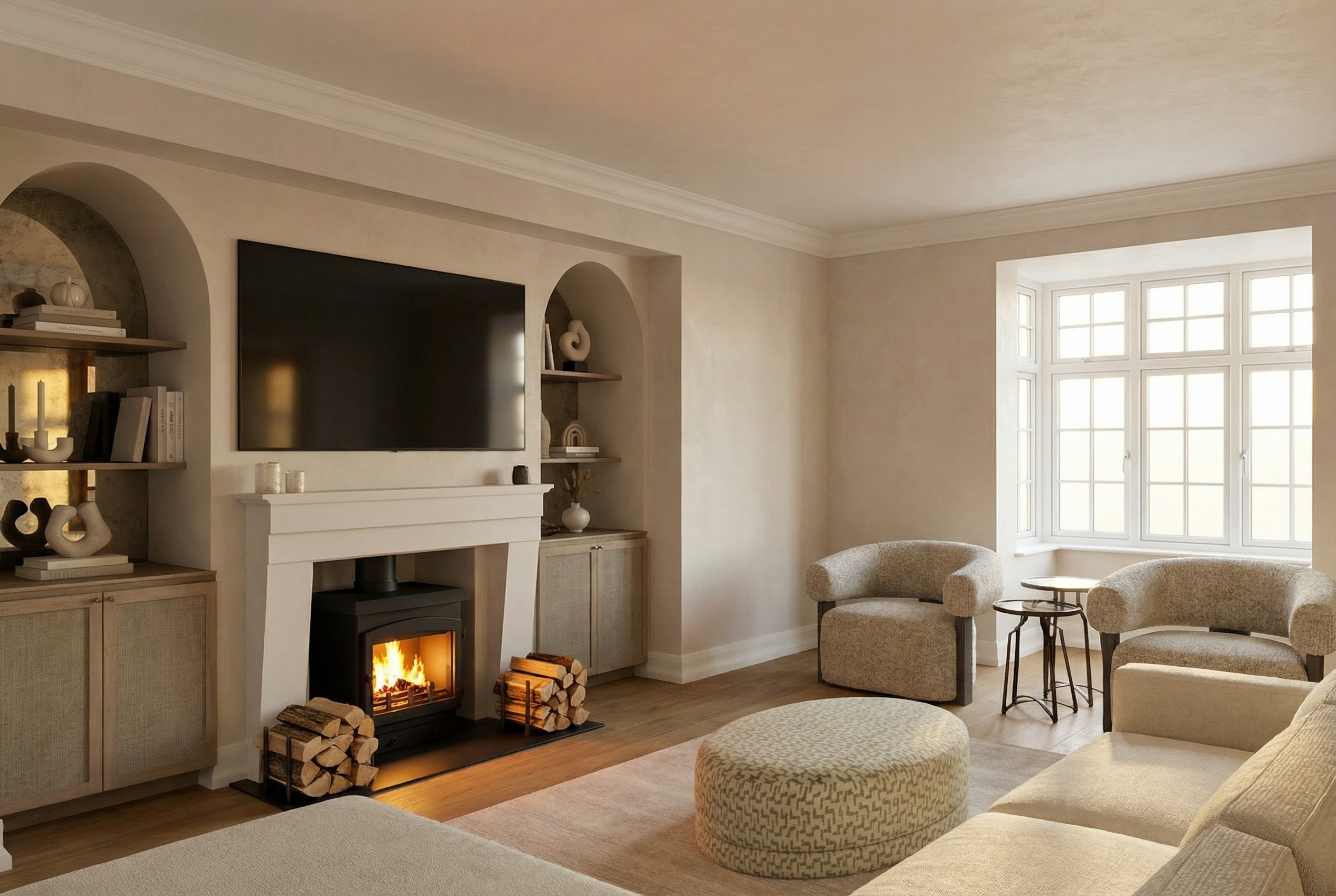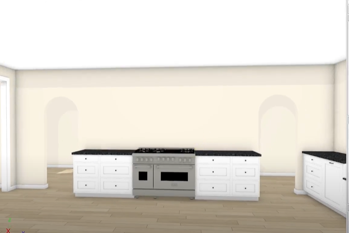 please bring this to a realistic image with beige cabinets and input upper cabinets and a over the range hood