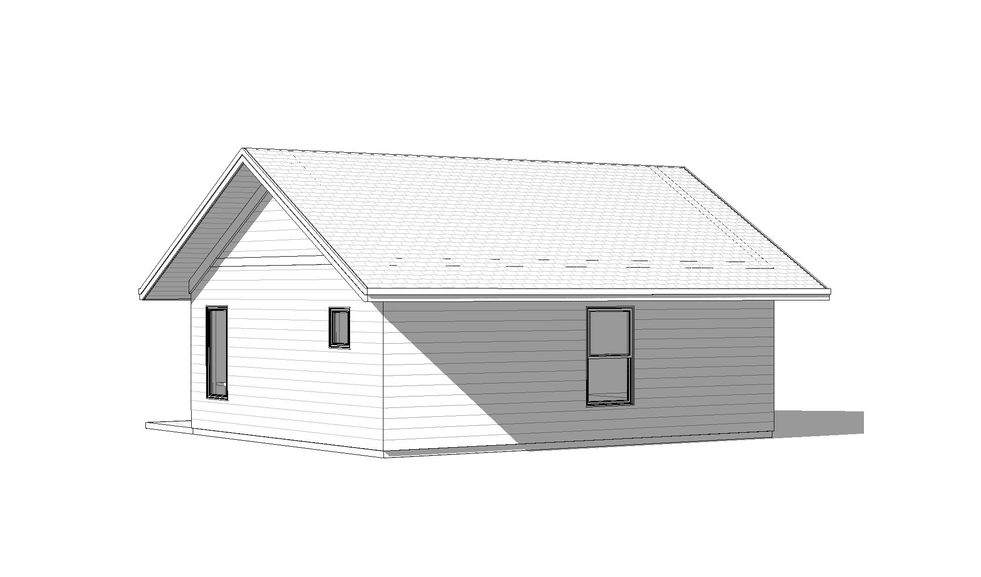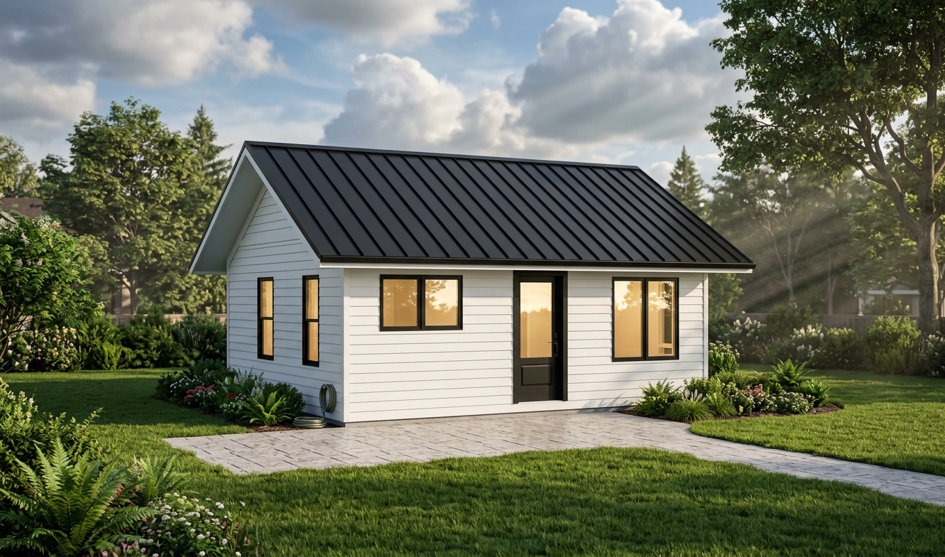 front view of a clean adu architectural exterior home rendered in cinematic day time lighting with bits of blue skies and sunlight coming through the clouds adu in a backyard neighborhood setting with faint streaks of light coming through trees in the surrounding area warm glow and reflections off of the windows blue sky with big billowy clouds clean white hardie siding green manicured landscape around structure with gardens and patches of grass black standing seam metal roof prominent trees in the background high fidelity photorealistic visualization crisp shadow falloff refined facade geometry soft atmospheric depth premium architectural photography mood ultra clean composition and materials black window trim photorealistic render small concrete path around the exterior of the adu hide concrete foundation grass in the foreground black window trim no grids in windows