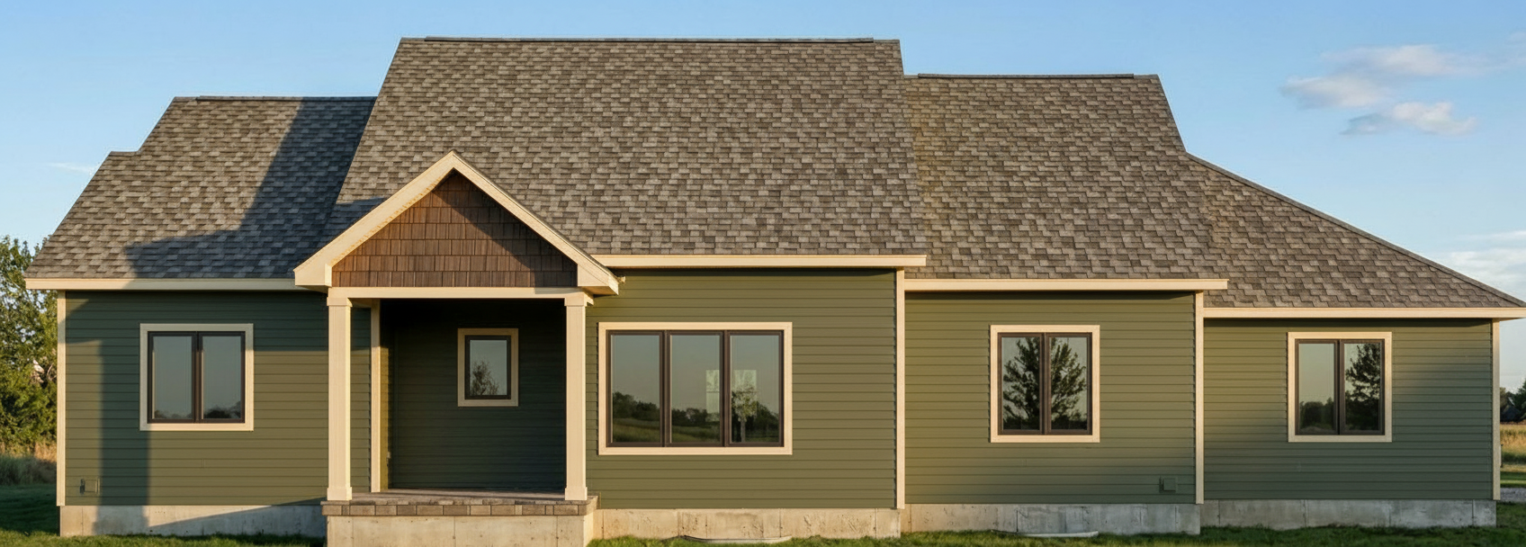keep everything the same but remove the thick cream colored trim around the perimeter of the windows keep the windows dark brown with no grids