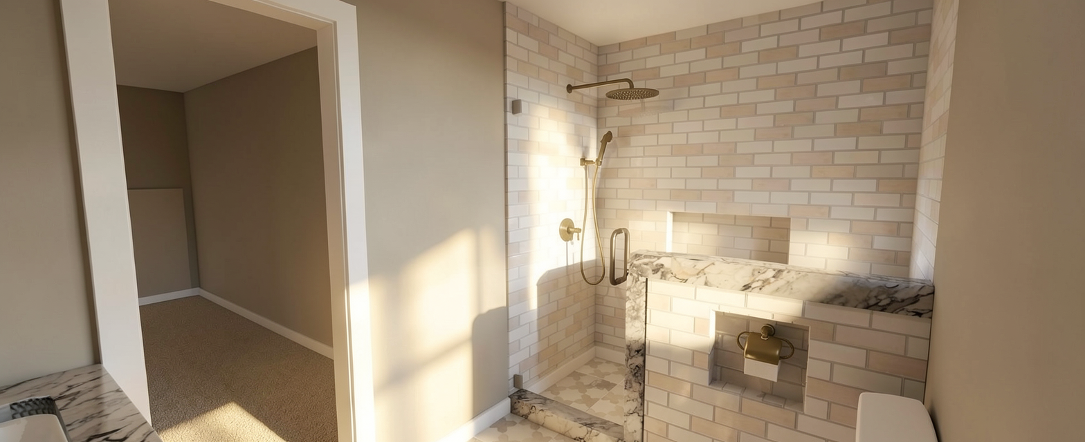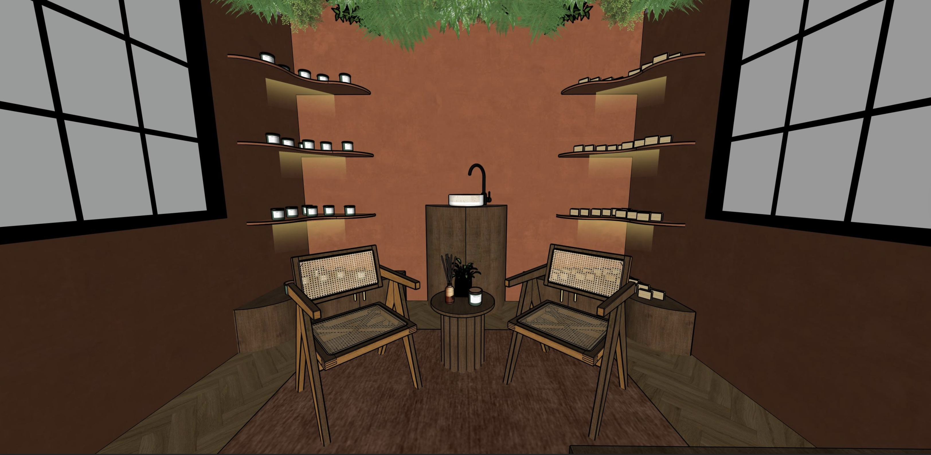 create a photorealistic render of a upmarket pop up kiosk inside a shopping mall the kiosk sells soaps and candles the walls are textured terracotta finish there are led lights under the wall shelves and downlights shining down from the overhead hanging plants the view outside the windows is of the shopping mall