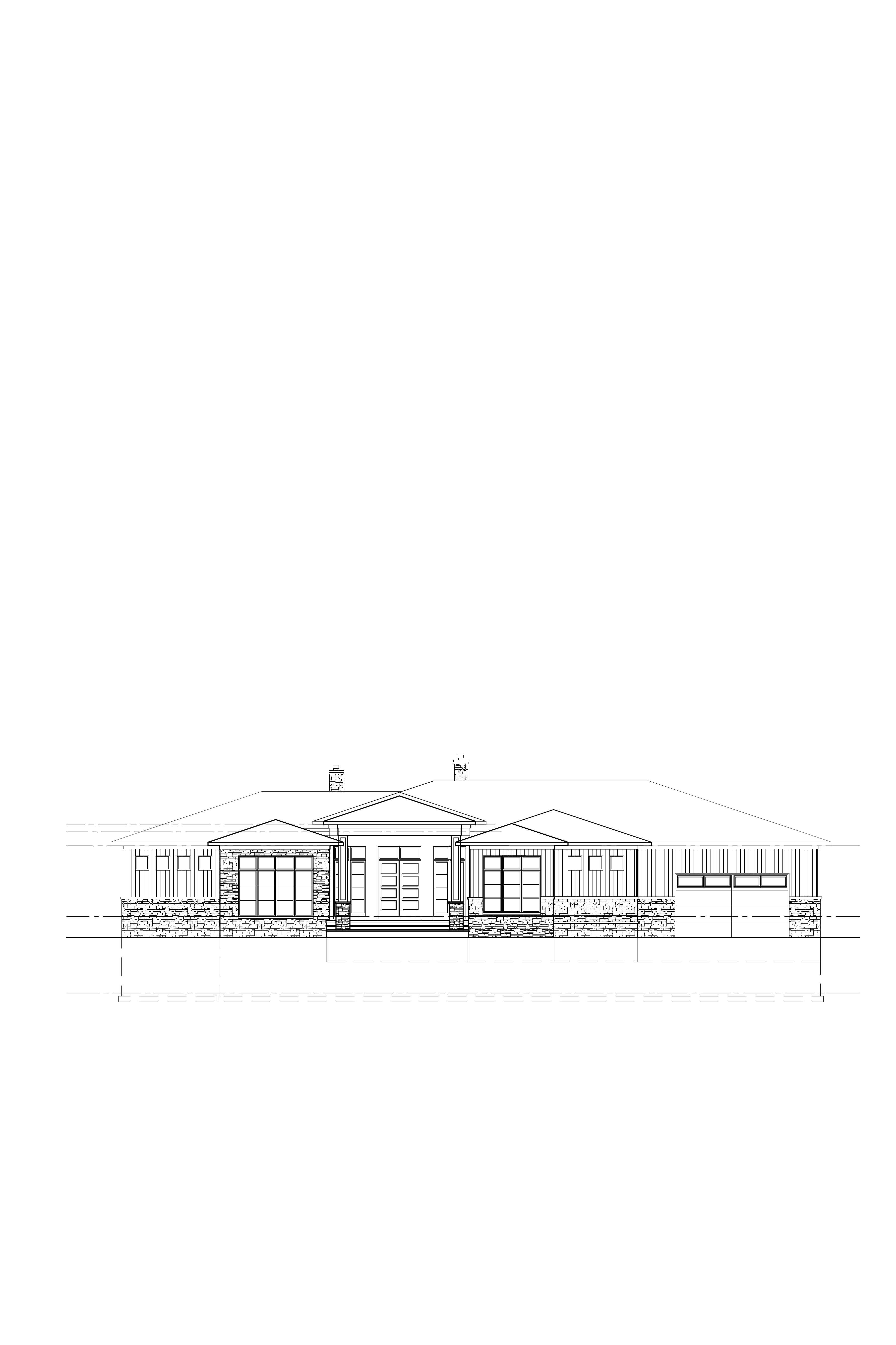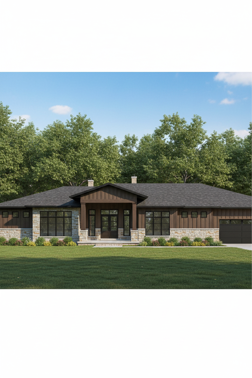 render with a light earth tone cultured stone stone sill black window trim and roof fascia board dark walnut vertical metal siding and charcoal color asphalt roofing show bushes and grass in front and tree line in rear and pull front entry door roof out 10 feet as a hip style roof with metal roofing and all front roofs show as hips show front entry colums with stone bases and 16 inch wood columns show entire garage to right