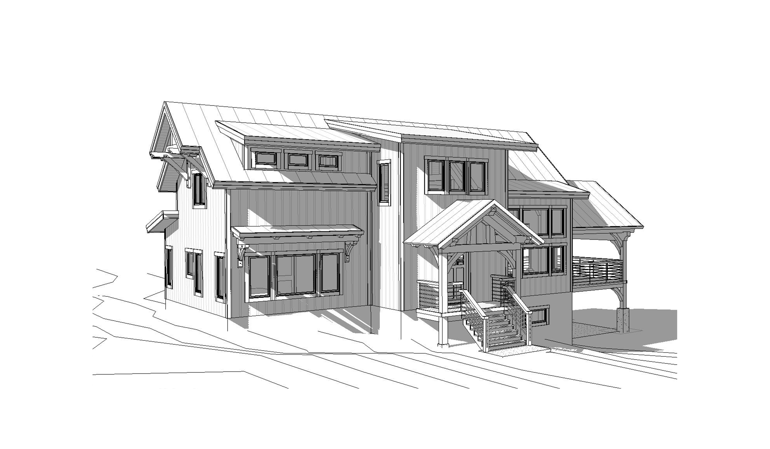 front view of a clean mountain modern architectural exterior rendered in cinematic vibrant day time lighting with vibrant colorful skies heavy timber architectural style black vertical select grade cedar siding with warm wood accents manicured landscaping around structure with hedges black standing seam metal roof prominent cinematic big douglas fir trees surrounding the house in the background this house is on a sloped hill thats above a valley below it in the foreground high fidelity photorealistic visualization crisp shadow falloff refined facade geometry soft atmospheric depth premium architectural photography mood ultra clean composition and materials black window trim dark roof trim photorealistic render