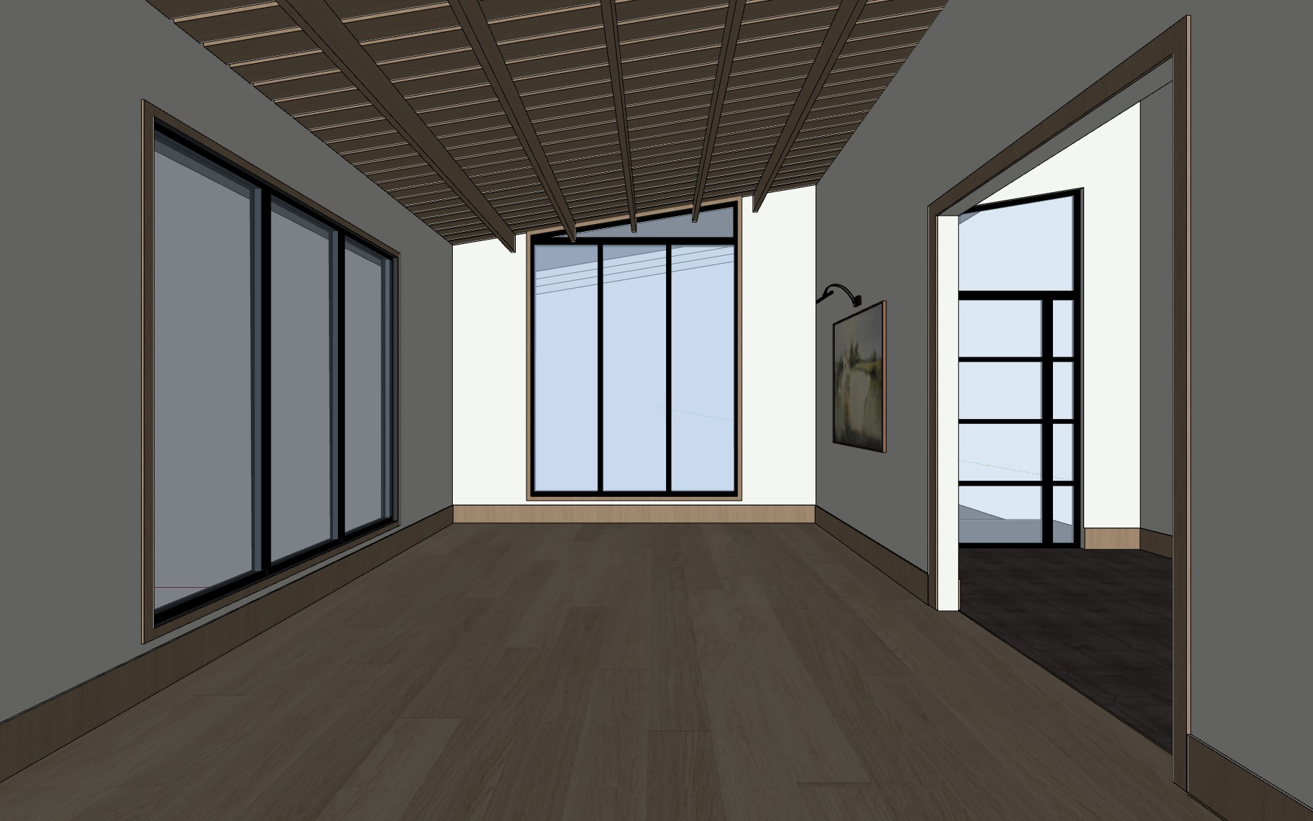 photorealistic enhancement of the provided architectural render preserve the exact architecture layout materials furniture placement and fixtures from the original image with no redesign or modifications the purpose is only to improve realism and lighting quality apply physically accurate global illumination and natural light behavior lighting should feel balanced and natural as in professional interior architectural photography soft indirect daylight fills the space with gentle light bounce from surrounding surfaces shadows are soft subtle and physically realistic with natural falloff all materials remain unchanged but respond to light more realistically stone surfaces with natural micro texture wood grain with depth matte plaster walls with soft diffusion and brushed metal fixtures with correct reflections no surfaces emit light unless they are actual light fixtures plumbing fixtures such as shower heads and faucets must remain non emissive and only reflect ambient light render as high end interior photography using a full frame camera with a 24 35mm architectural lens balanced exposure realistic dynamic range subtle depth of field and natural color grading the image should look like a professionally photographed luxury interior rather than a computer render do not change architecture do not change materials no redesign no new objects no additional lights no glowing fixtures no light from shower heads or faucets no dramatic shadows no surreal lighting no warped geometry no stylization the windows looking out to the exterior should be displaying mountains in the distance some trees and later in the afternoon the floor should be light medium oak wood planks like shown in original image