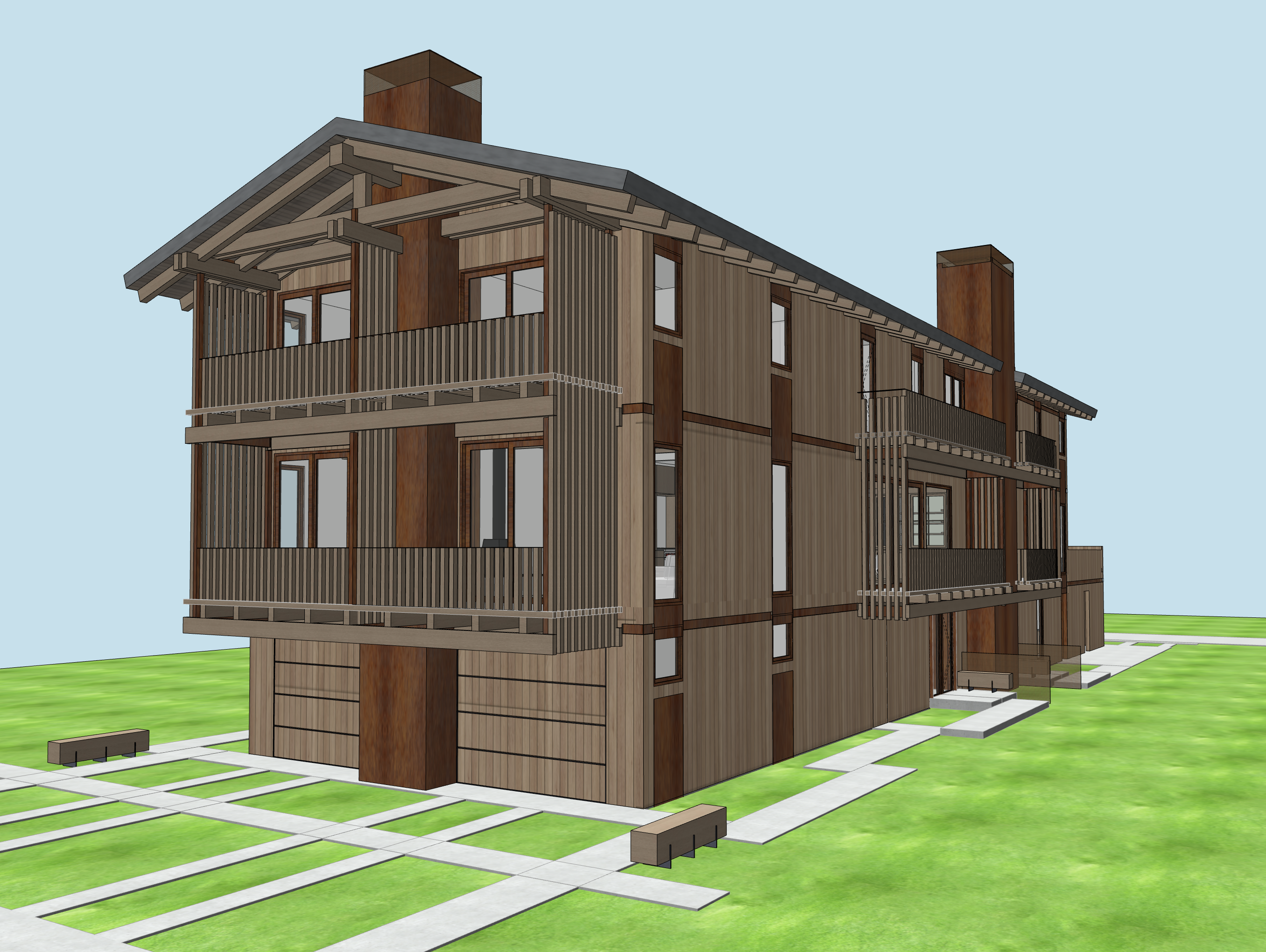 add landscaping in the background a few small aspens and pine trees small shrubs near the building a few small buildings in the background and a small hill in the distance