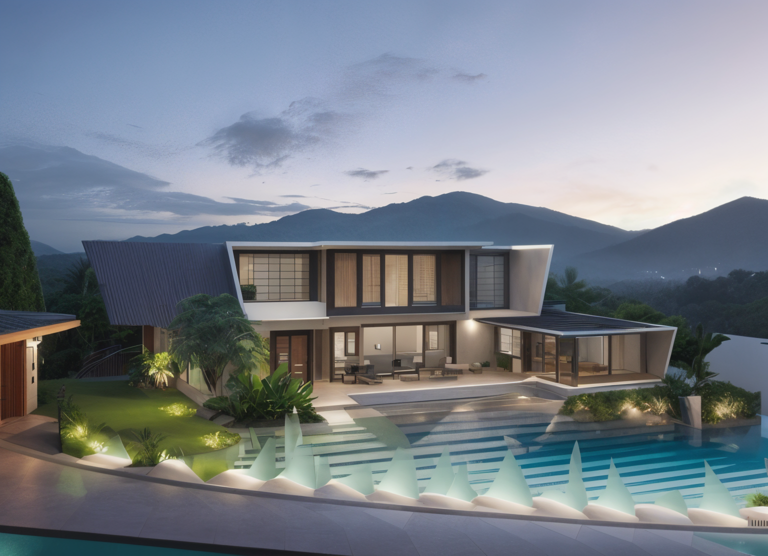 midday exterior light with interior lights on limestone and wood on exterior surfaces sleek glass with black frames and lush tropical gardens pool with clear water and foreground with small natural boulders and retaining wall as shown in image pacific ocean view in background and beyond