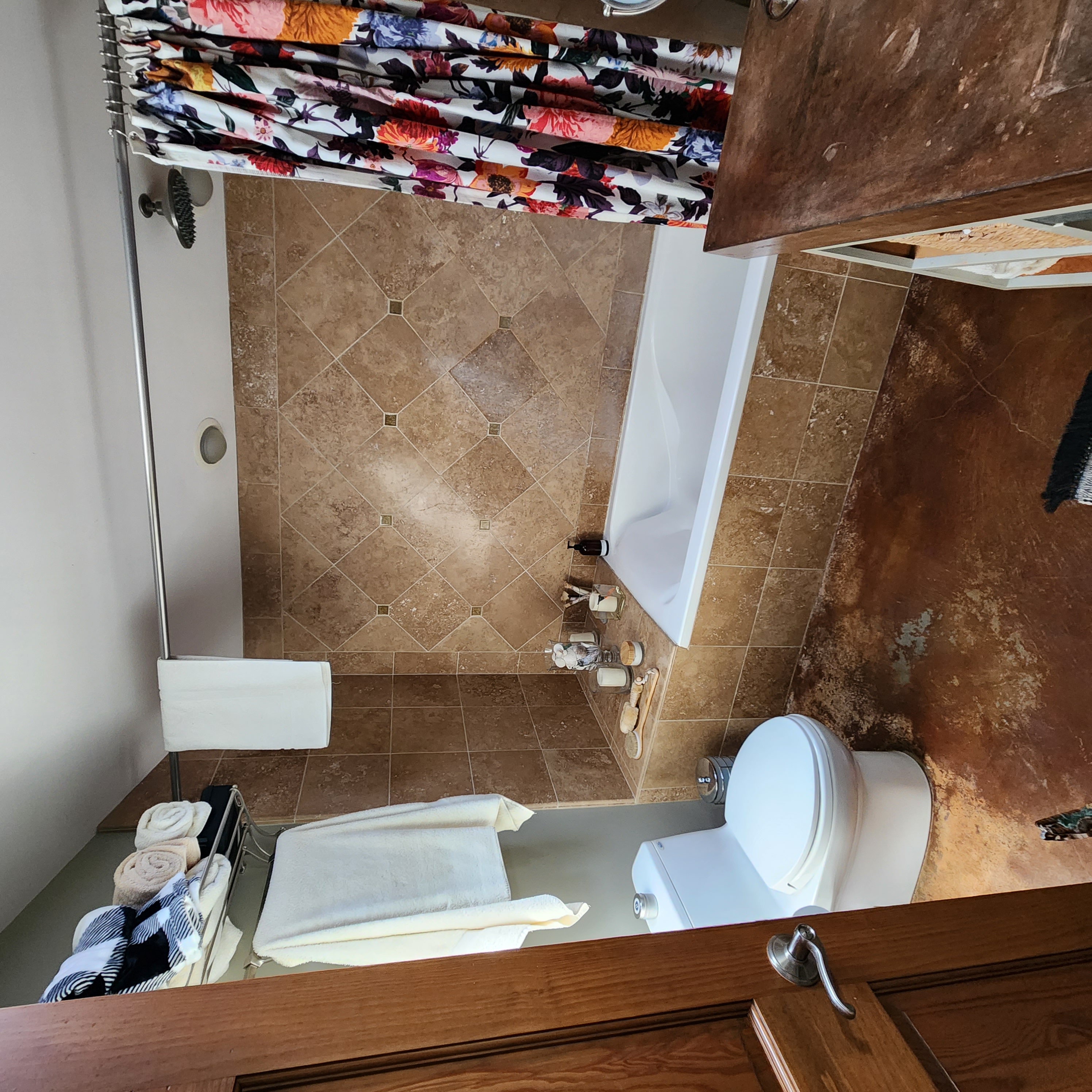 remove the bathtub and curtain and put in a walk in shower with built in shelves to the left keep the floor as it is leave the toilet as it is architecture