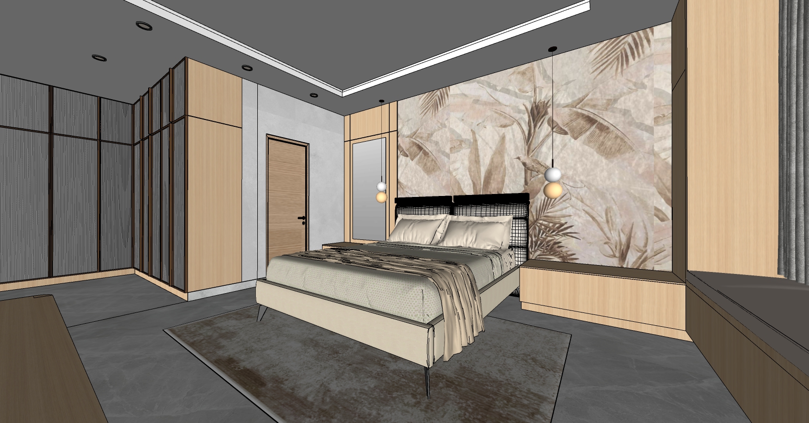 generate a realistic render of the master bedroom provide illumination for light fixturess and add cove ceiling retain the exixting flooring